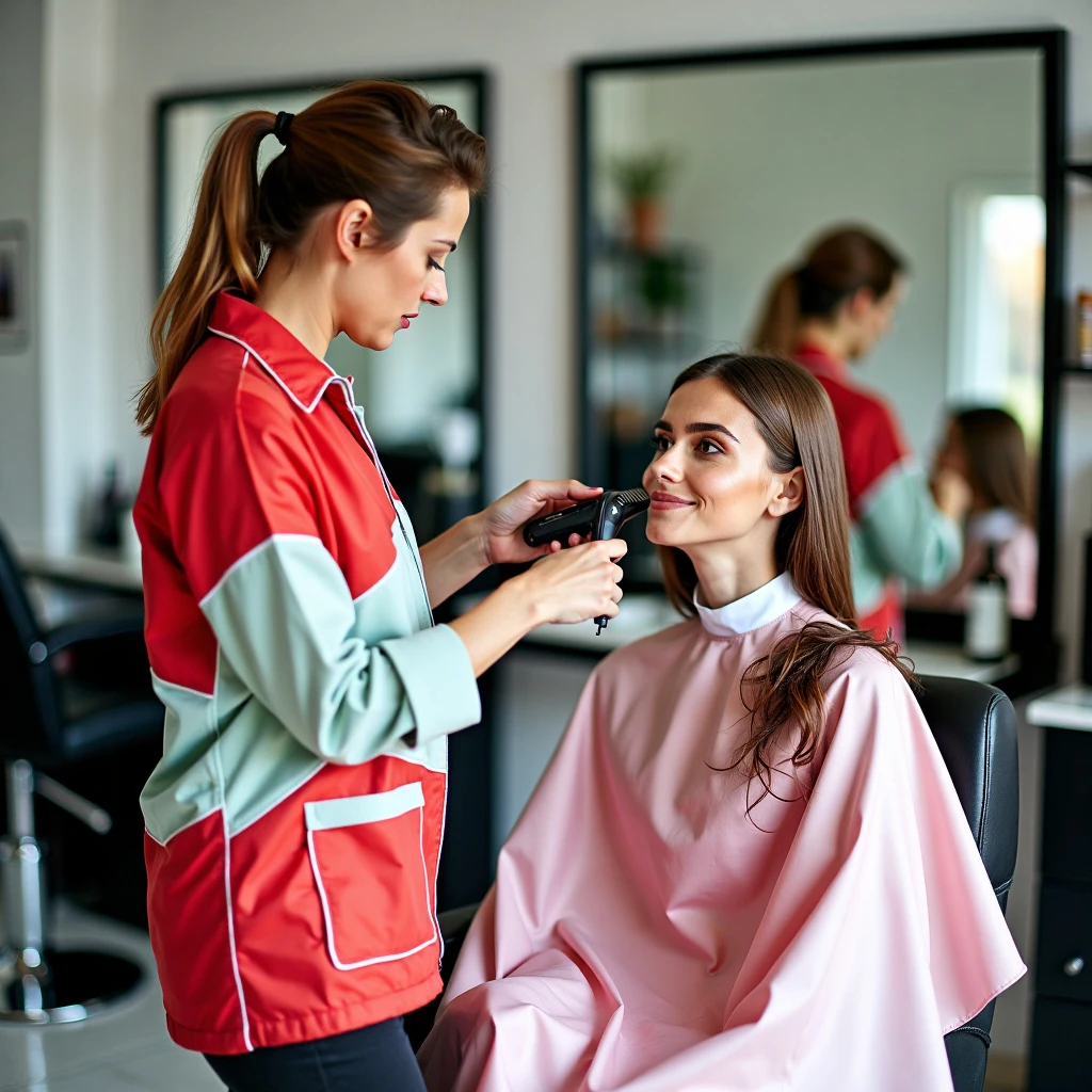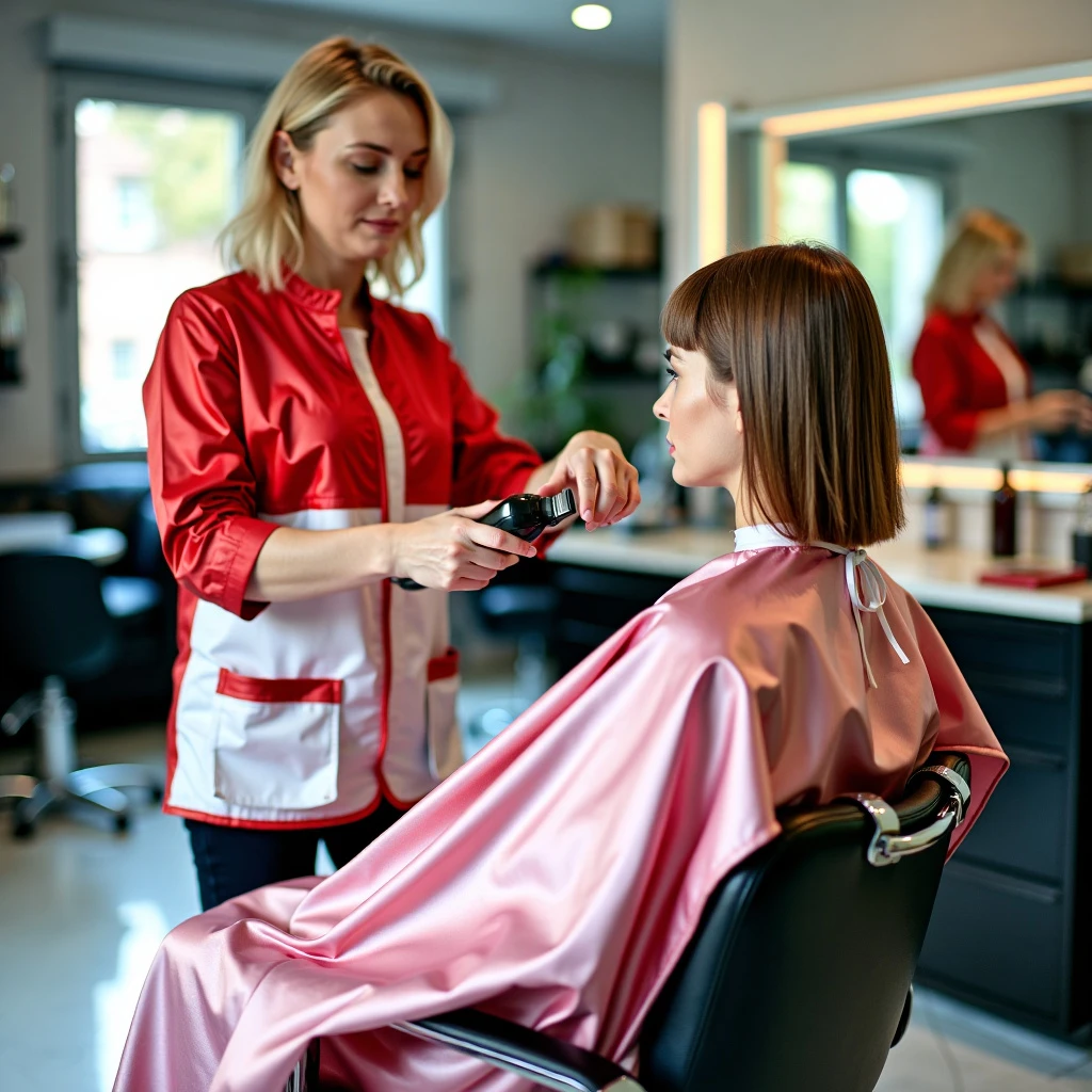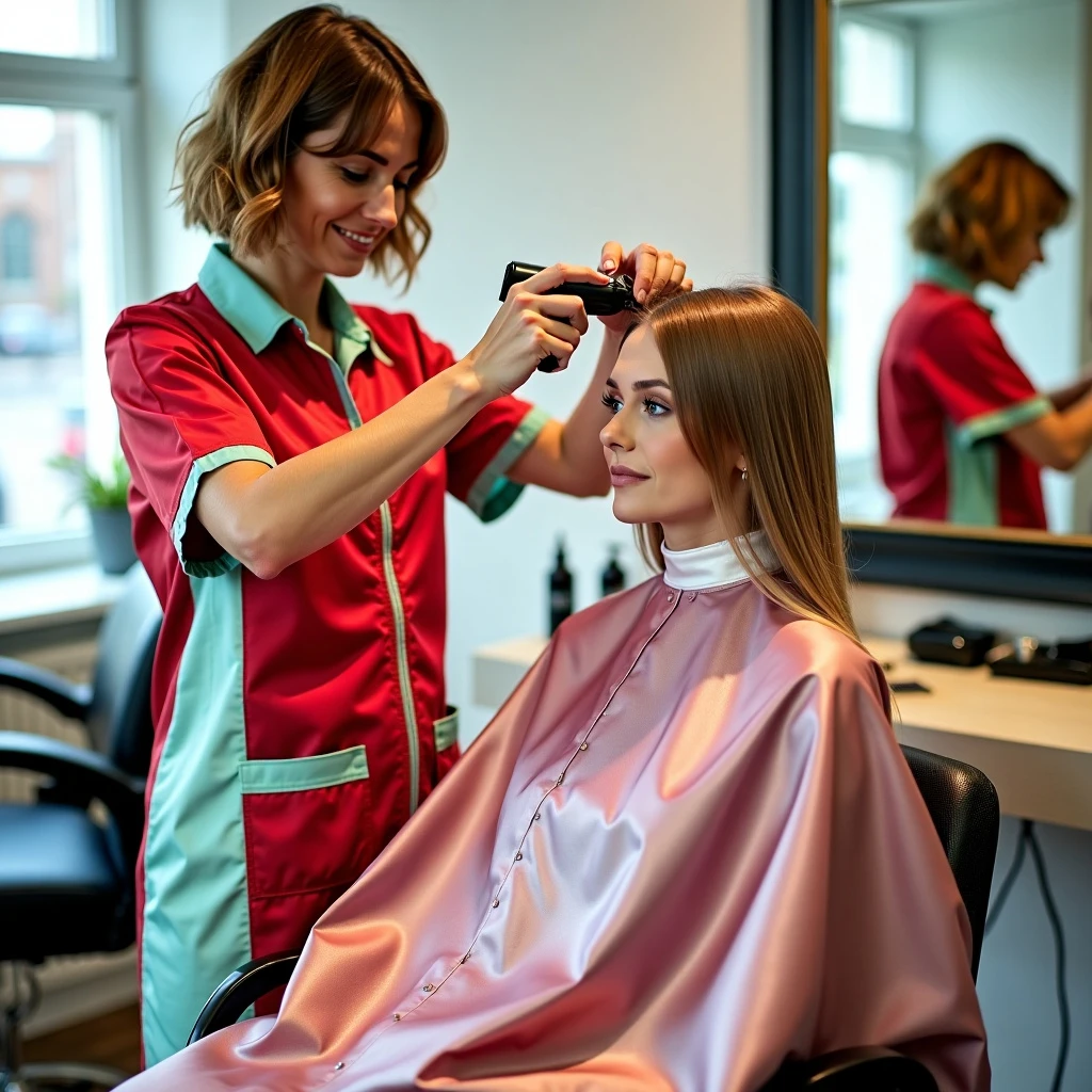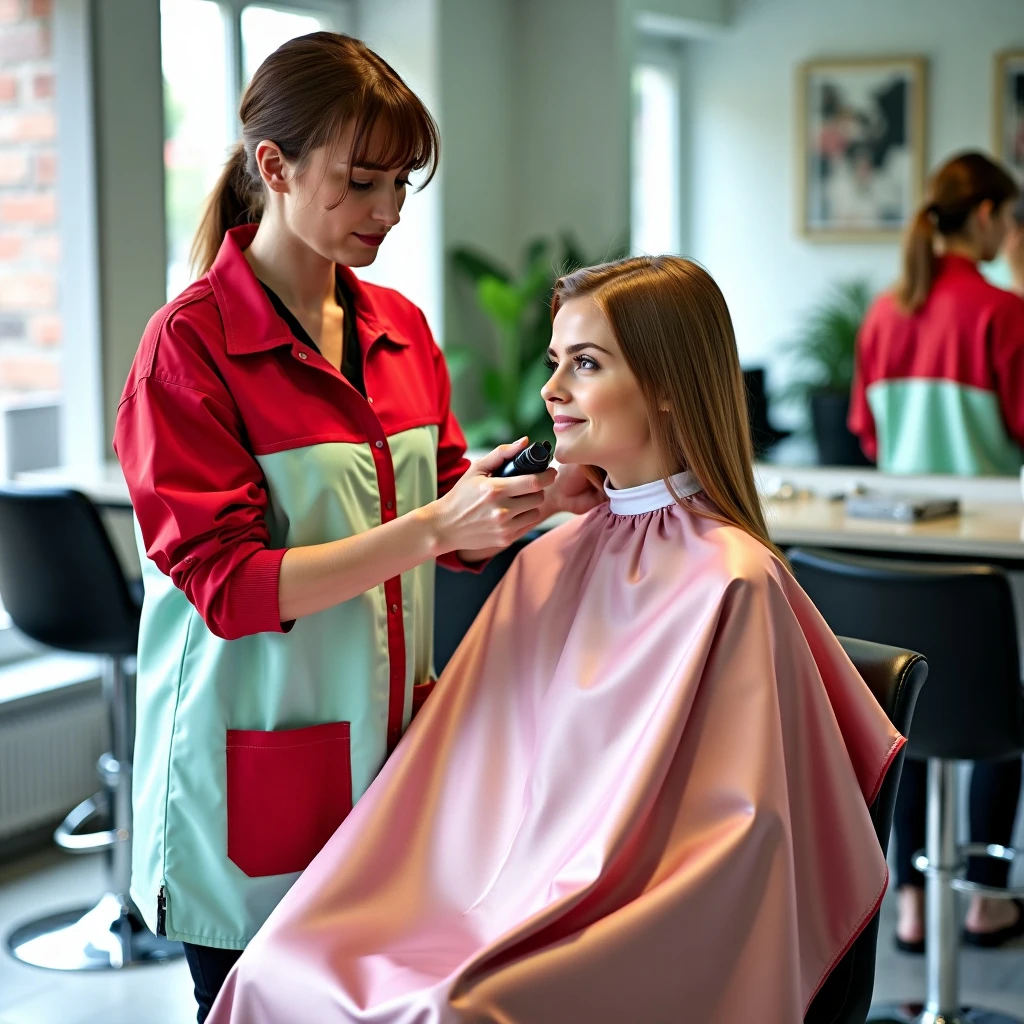 A Swedish female hairdresser wearing a short red and white and mint shiny Nylon barber smock with two pockets, open zipper, standing in a hair Salon. White floor full with cut off hair. She is giving a haircut to a female cllient who is wearing a cremy pink satin barber cape and a white neckstrip. The client is sitting in a barber chair in Front of a big mirror. Her hair is straight and very very short. A lot of cut off hair is lying on the cape. The hairdresser is holding a hairclipper in her left Hand.