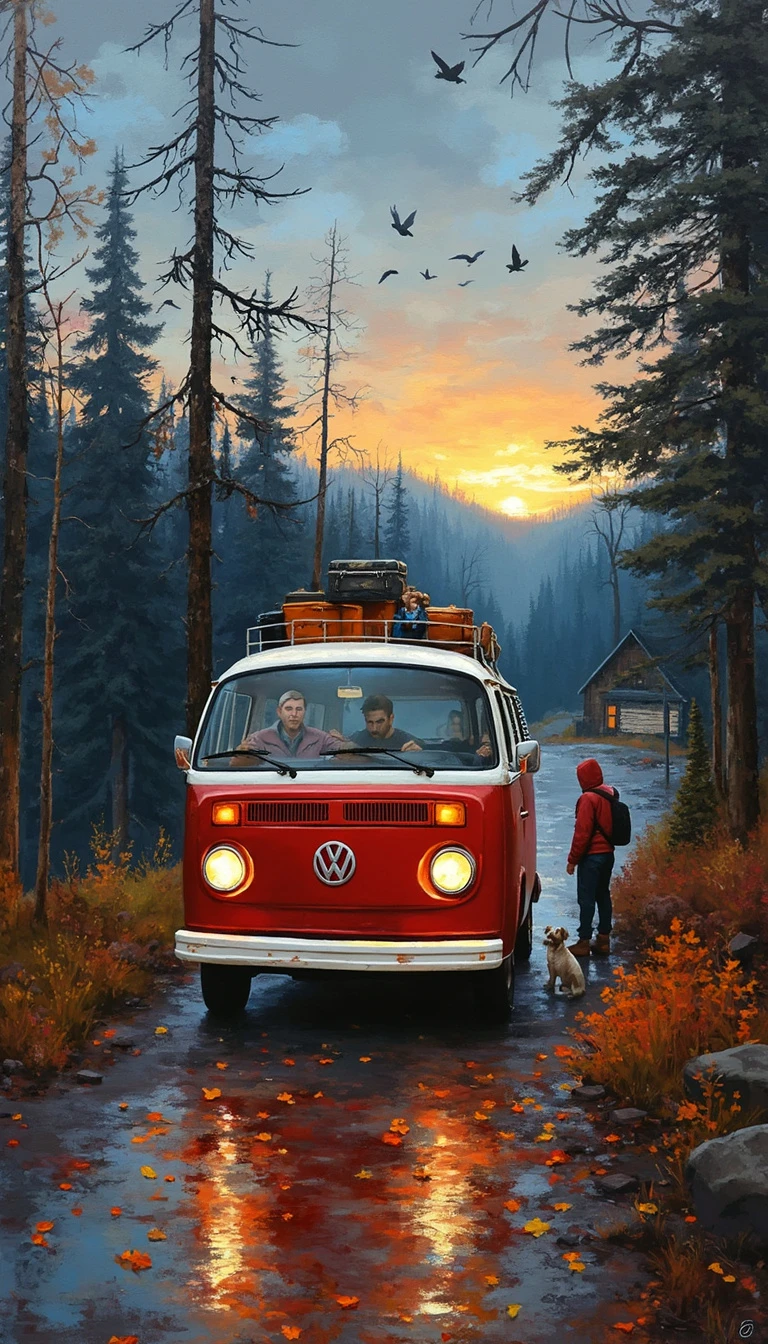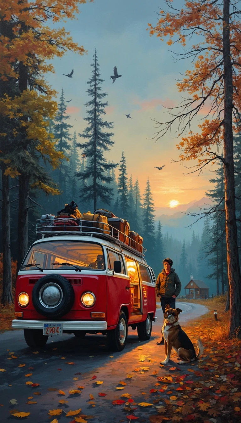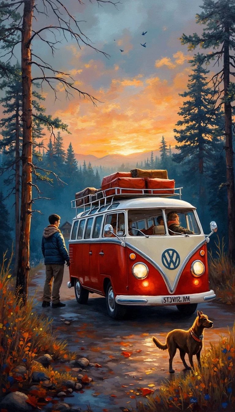 oil painting acrylic brushstrokes of red and white volkswagen transporter t1 packed with luggage on top parked near a forest in Canada. Poles on the side of the road and cabin in the distance. a couple and a dog outside the van. The couple are a man and a woman. There is a sunset behind the distant trees and the sky is a bit orange. The whole atmosphere is a bit dark and moody as the night starts to settle in. The car has it stops light up and the headlights are beaming. There is light coming inside of the van. birds are flying around. It is autumn and some of the trees do not have leaves anymore. Lots of yellow, orange, brown leaves are on the ground Highly detailed image