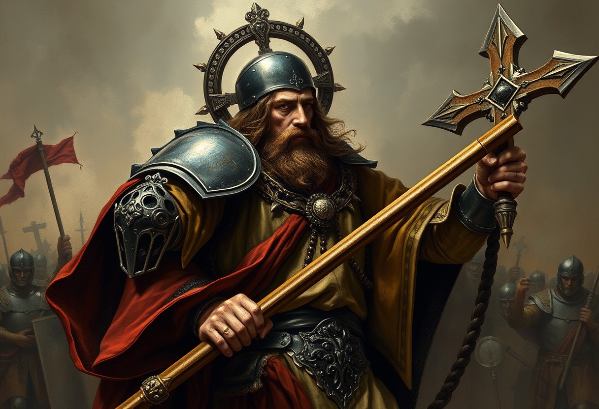 Jesus Christ, cladded in heavy armor, wielding a cross polearm, leading the armies of God to the eternal crusades Dark, oppressive, gothic style, realistic painting