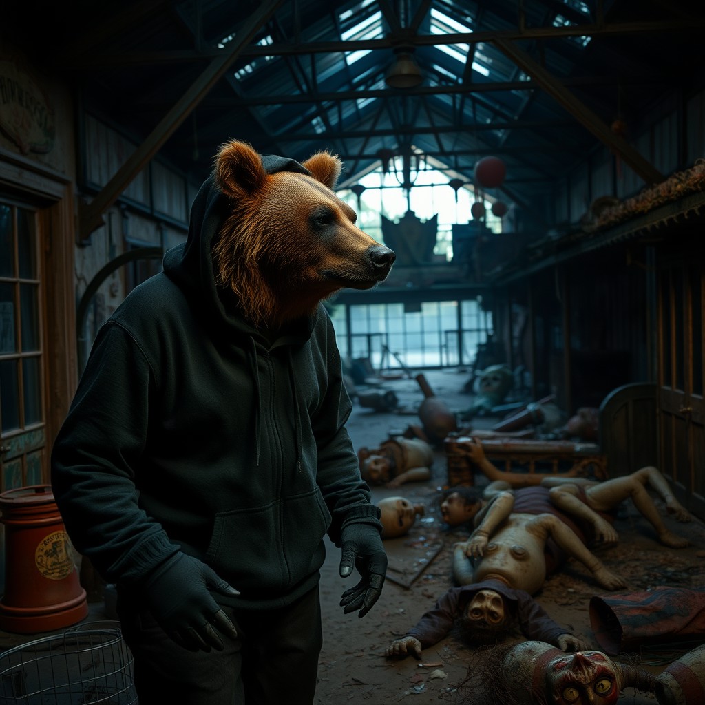 An anthro grizzly bear urban explorer wearing a black hoodie is walking through a house of horrors in an abandoned amusement park. Various deteriorated and broken scary props are lying around. It is late evening and the scene has an eerie atmospheric cinematic look with contrasting shadows and light.
