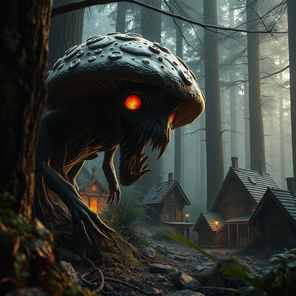 (masterpiece sci-fi dark gritty hyperrealisitic concept art 8k) fungi capibara zombie thing attacking a cozy perfect forest town, menacingly close up, atmospheric lighting, dappled light forest