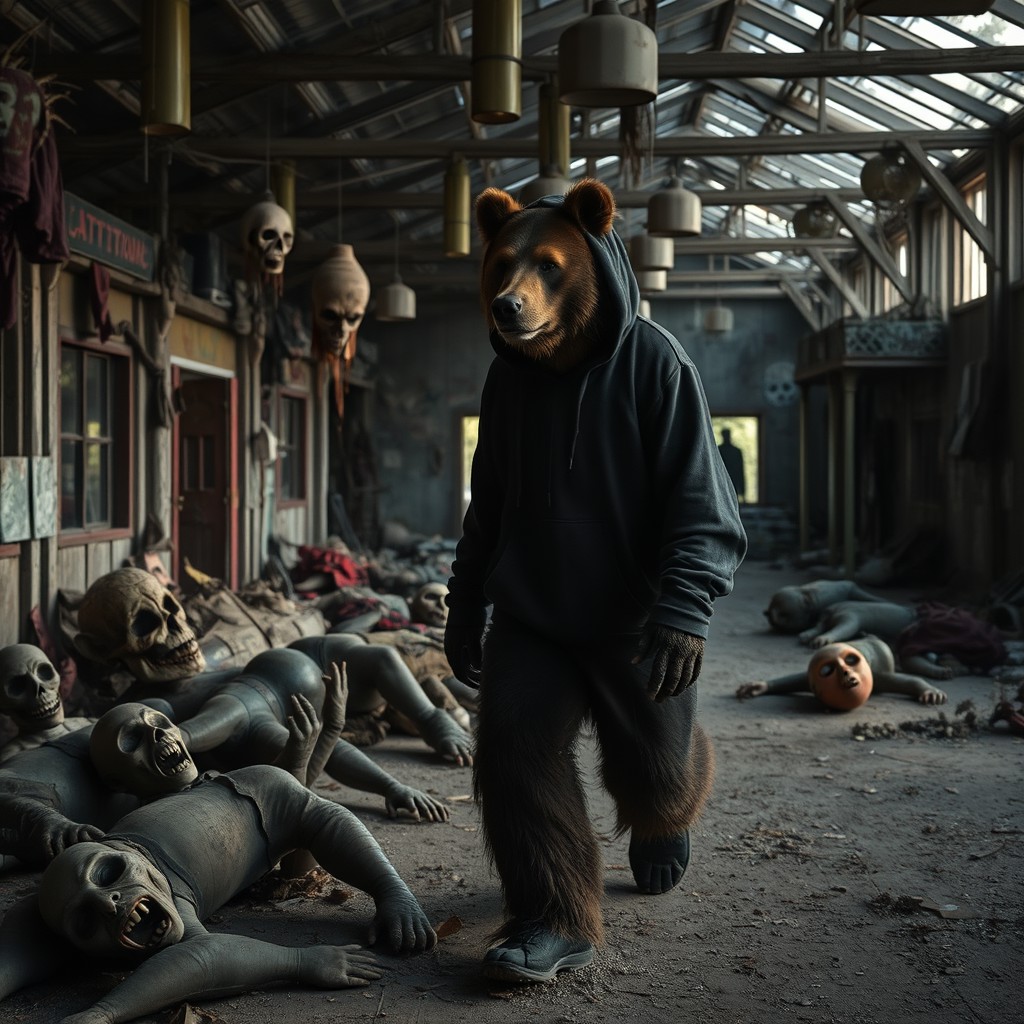 An anthro grizzly bear urban explorer wearing a black hoodie is walking through a house of horrors in an abandoned amusement park. Various deteriorated and broken scary props are lying around. It is late evening and the scene has an eerie atmospheric cinematic look with contrasting shadows and light.