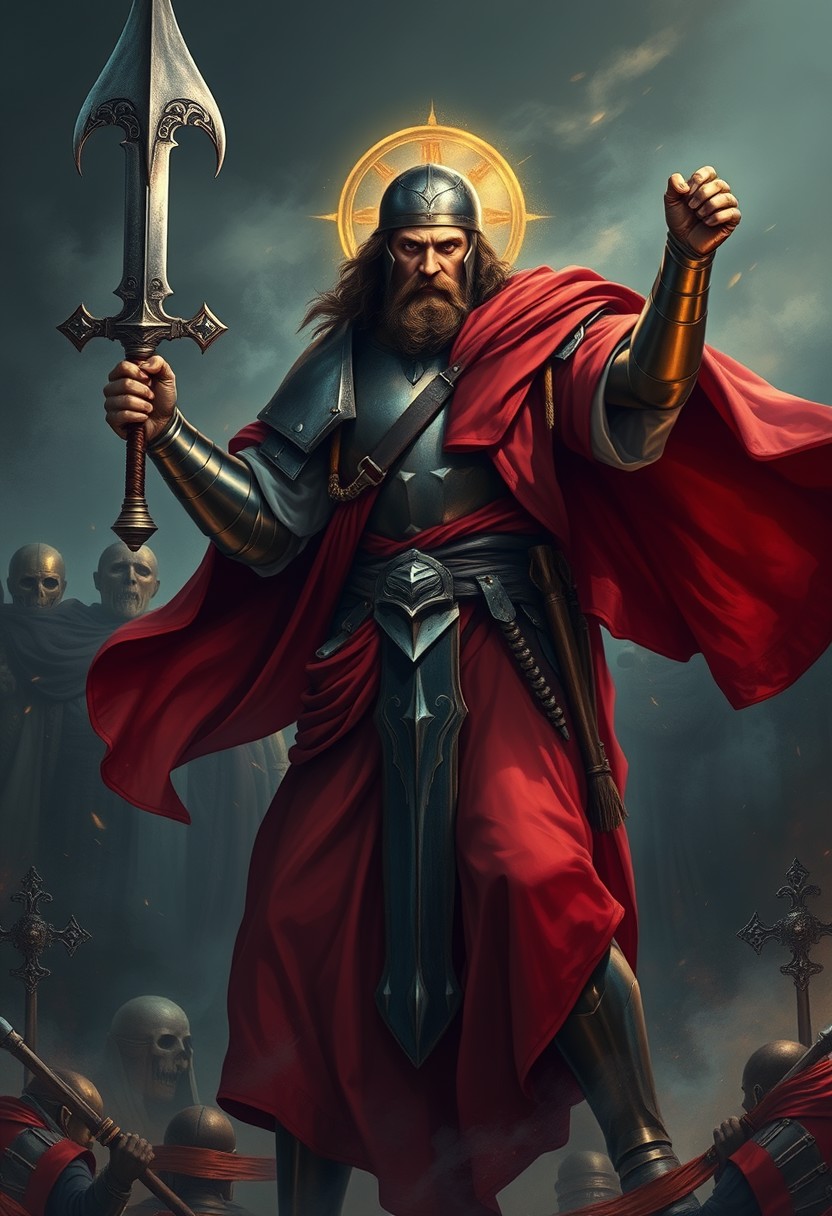 Jesus Christ, fladder in heavy armor, wielding a zweihander, about to cleanse infidels Dark fantasy style