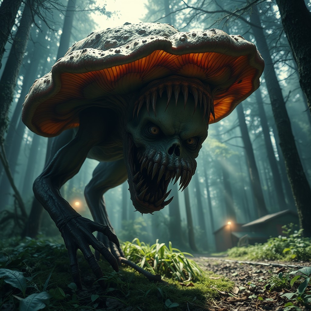 (masterpiece sci-fi dark gritty hyperrealisitic concept art 8k) fungi animal creature zombie horror attacking a forest town, menacingly close up, atmospheric lighting, dappled light forest