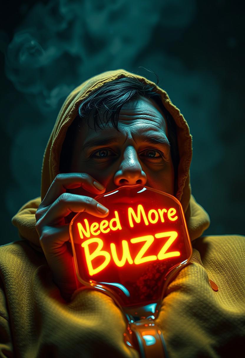 Heroin addict going through withdrawal, instead of heroin it is honey, out of honey, honey addict, glowing sign that reads "Need More Buzz" Highest quality, masterpiece, 4k, concept art,