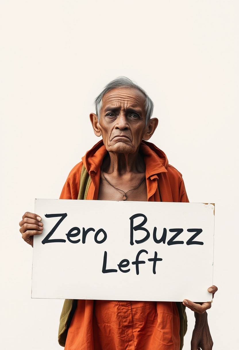 Text "Zero Buzz Left", text, Man, poor, bigger, holding a sign, run down, clothing, crying, very sad, very skinny,