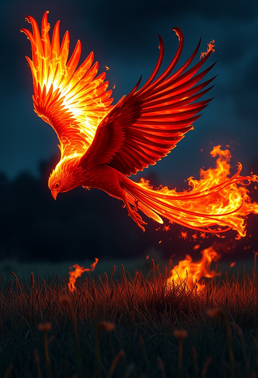 a hellish phoenix flying over a meadow at night, its wings are covered with fire, the fire from its wings flows onto the meadow and sets it on fire, fantasy, real image