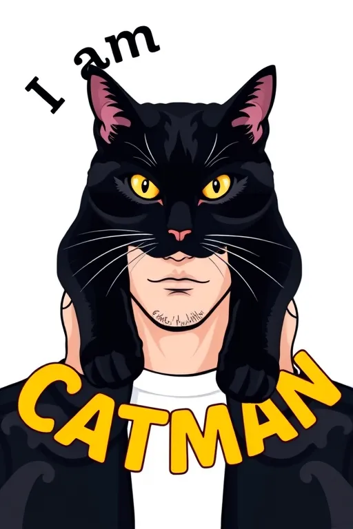 A stylish, minimalist illustration featuring a black cat with striking yellow eyes, positioned in front of a person's face. The person is holding the cat above their head, with their arms spread out. The words "I am Catman" are displayed in a trendy, colorful typeface, encircling the scene. The overall design exudes a modern, fashionable vibe, perfect for a trendy T-shirt that celebrates the joy of pet ownership., typography, product, fashion, illustration