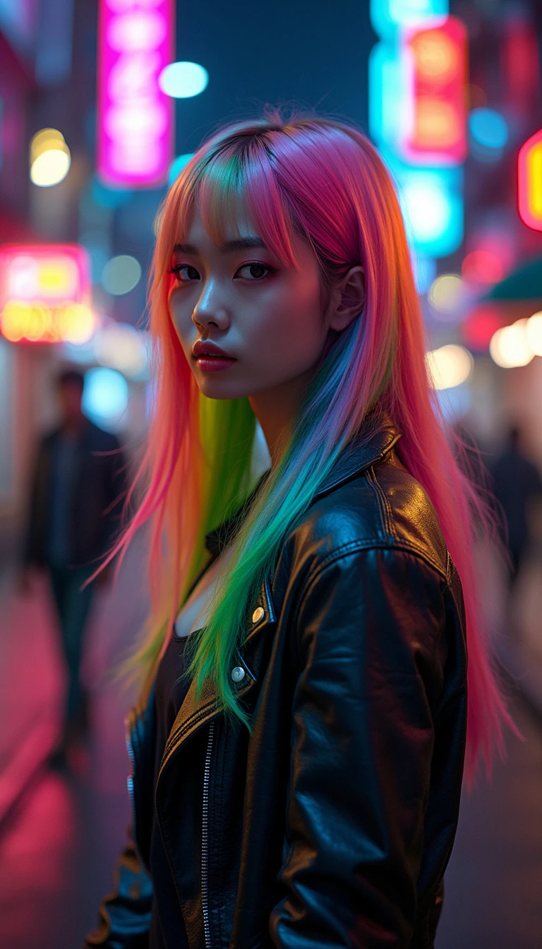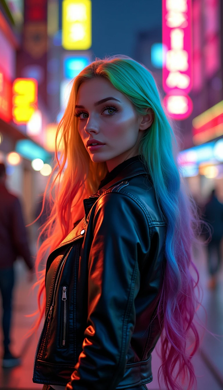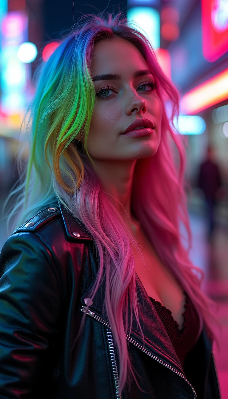 A digital art portrait of a woman with long, vibrant, rainbow-colored hair wearing a black leather jacket, standing against a blurry neon-lit cyberpunk city street background. The color style should be hyperrealistic and vibrant, with an emphasis on neon colors and iridescent reflections. The lighting is dramatic, with bright neon highlights and deep shadows, capturing the cyberpunk atmosphere. Use a shallow depth of field with the camera focusing on the woman, making her stand out against the bustling city lights.