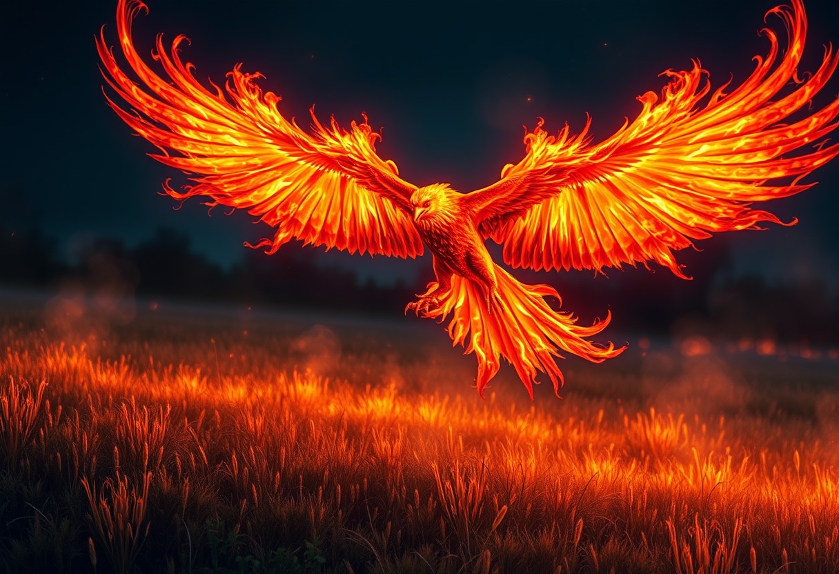 a hellish phoenix flying over a meadow at night, its wings are covered with fire, the fire from its wings flows onto the meadow and sets it on fire, fantasy, real image
