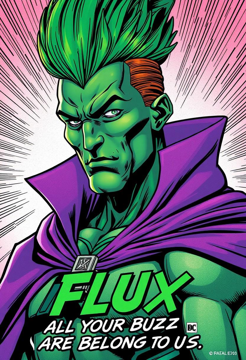 Comic book panel of a green faced half man half cyborg with tall green hair and wearing a purple cape. Below the panel of the man there is a caption that reads "FLUX: ALL YOUR BUZZ ARE BELONG TO US.", Highest quality, masterpiece, 4k, concept art,
