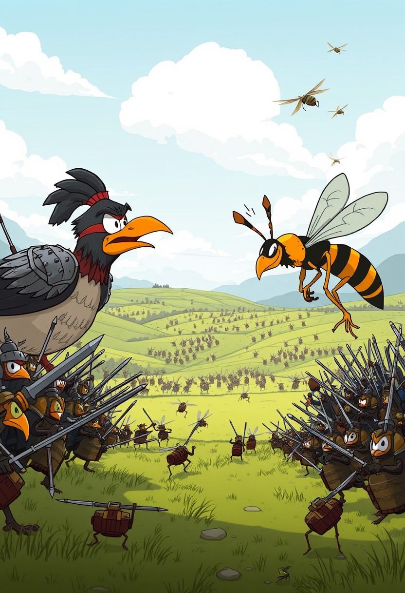 Landscape view of a battlefield, cartoon, about to face off, (birds wearing armour on left side: 1.5), (wasps wearing armour on right side: 1.5), flying, carrying weapons, ((massive armies)), anthropomorphic facial expression, angry expression, picture induces humour