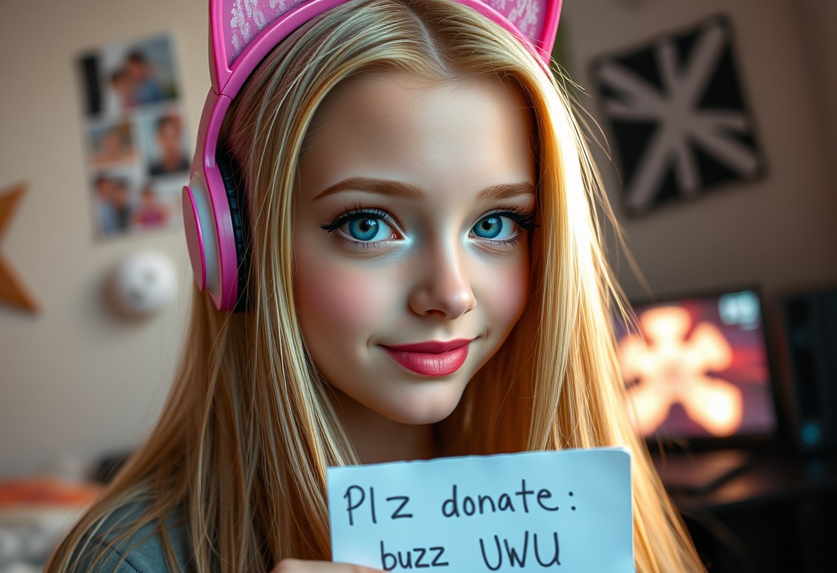 ((score_9, score_8_up, score_7_up) (masterpiece, best quality, highres, realistic, best quality)) Hot Attractive gamer girl, with long blonde hair, blue intense and deep eyes, cute face, 19 years old, while she looks at the camera, with a cute smile, holding a piece of paper saying:"Plz donate buzz UWU", on her head she has pink gamer cat girl head phones, on the background you can see her bedroom with a gaming setup in the back.
