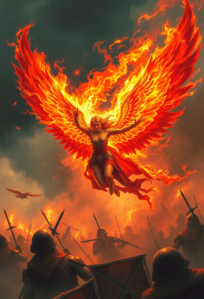 A valkyrie engulfed in flames with large wings flies on wings over the battlefield
