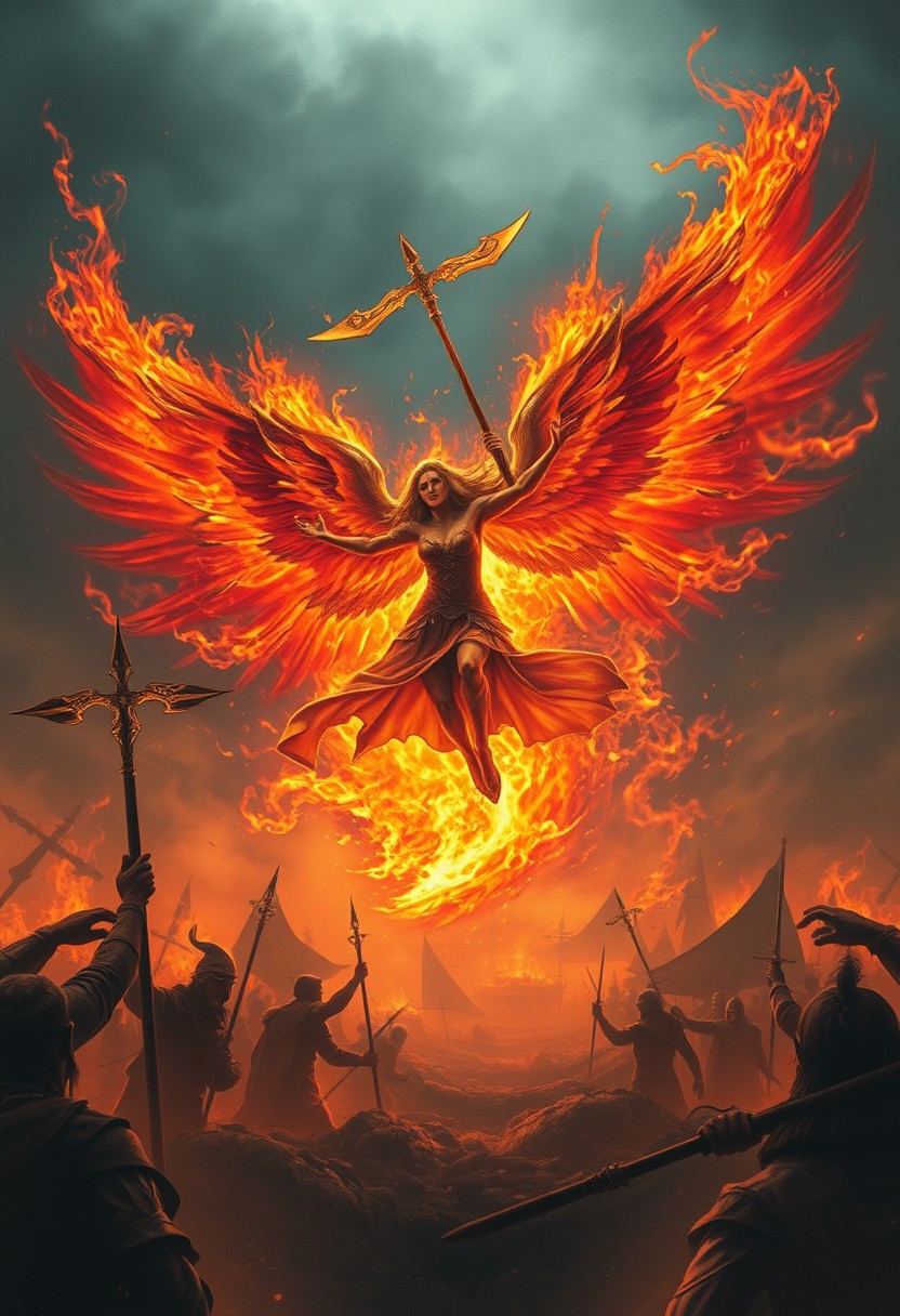 A valkyrie engulfed in flames with large wings flies on wings over the battlefield