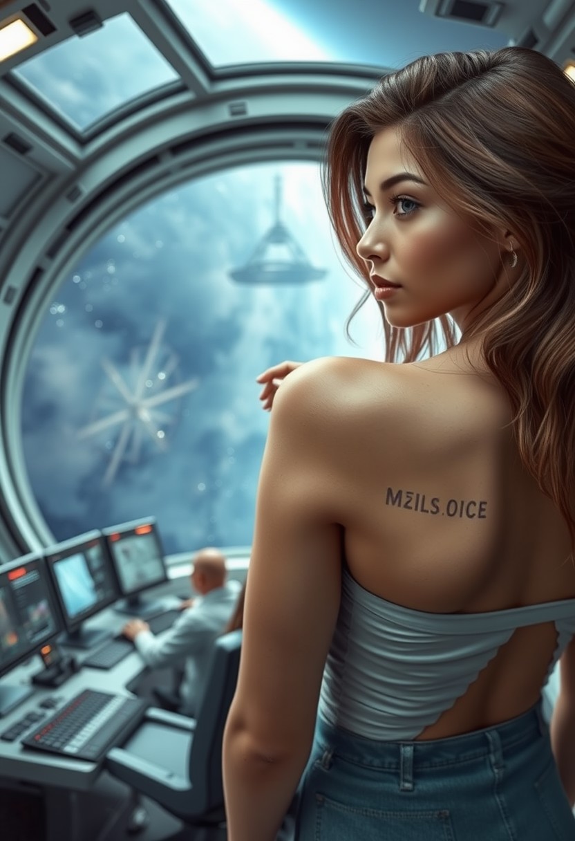 A sexy girl looks from behind, a 25-year-old girl, a girl stands on the bridge of a spaceship, computers with workers under the bridge, a huge panoramic glass through which space is visible