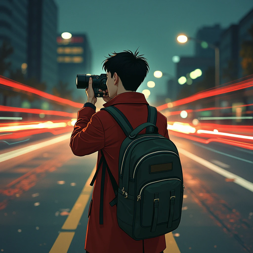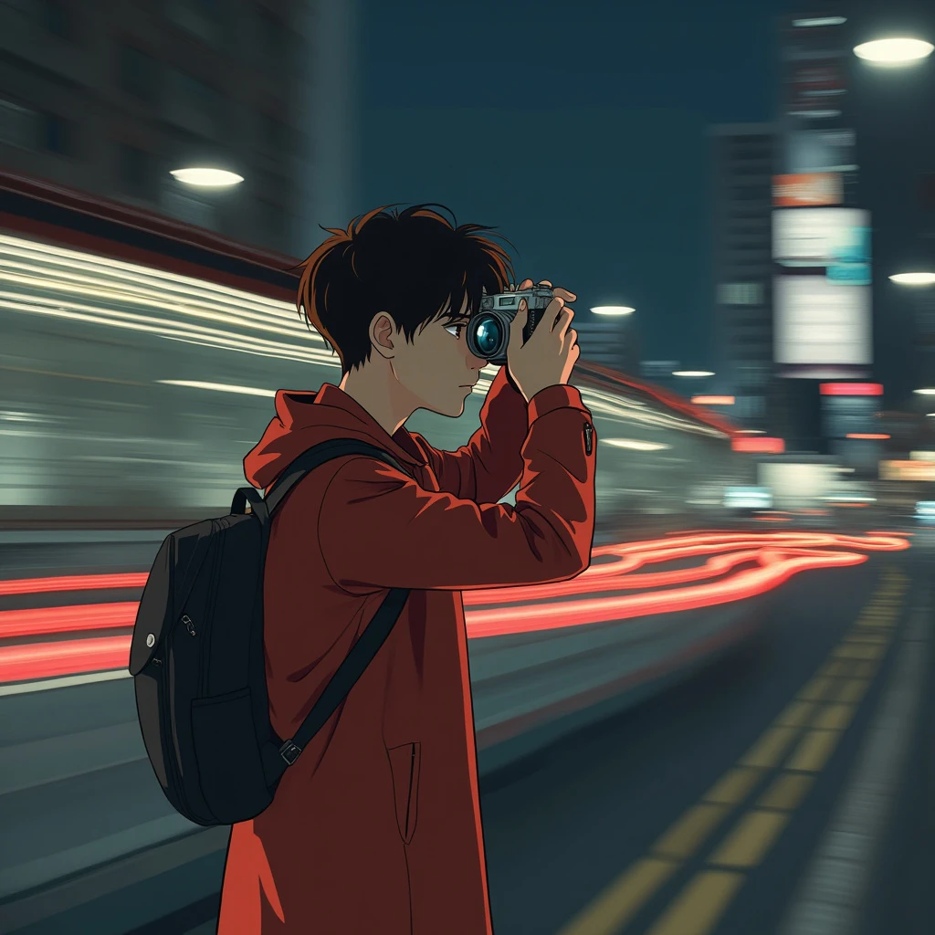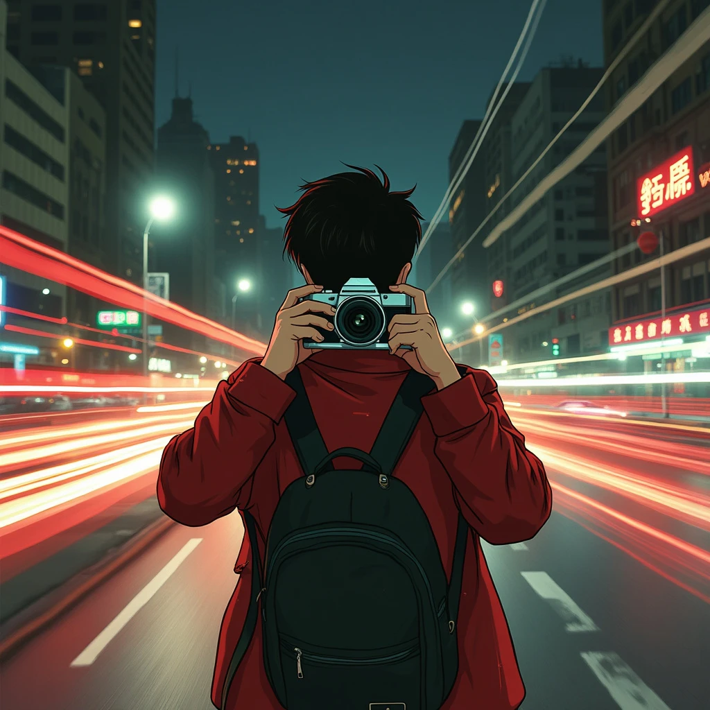 A 17 years old man taking photos with a small vintage silver camera, we can't see his face, we just see his back pack, he's wearing a red coat, he's in the middle of a night city where everything moves too fast, slow shutter speed, a lot of light streaks behind and in front of him, car light streaks, red and white lights lines behind him, large street with buildings, katsuhiro otomo style, Japan animation style