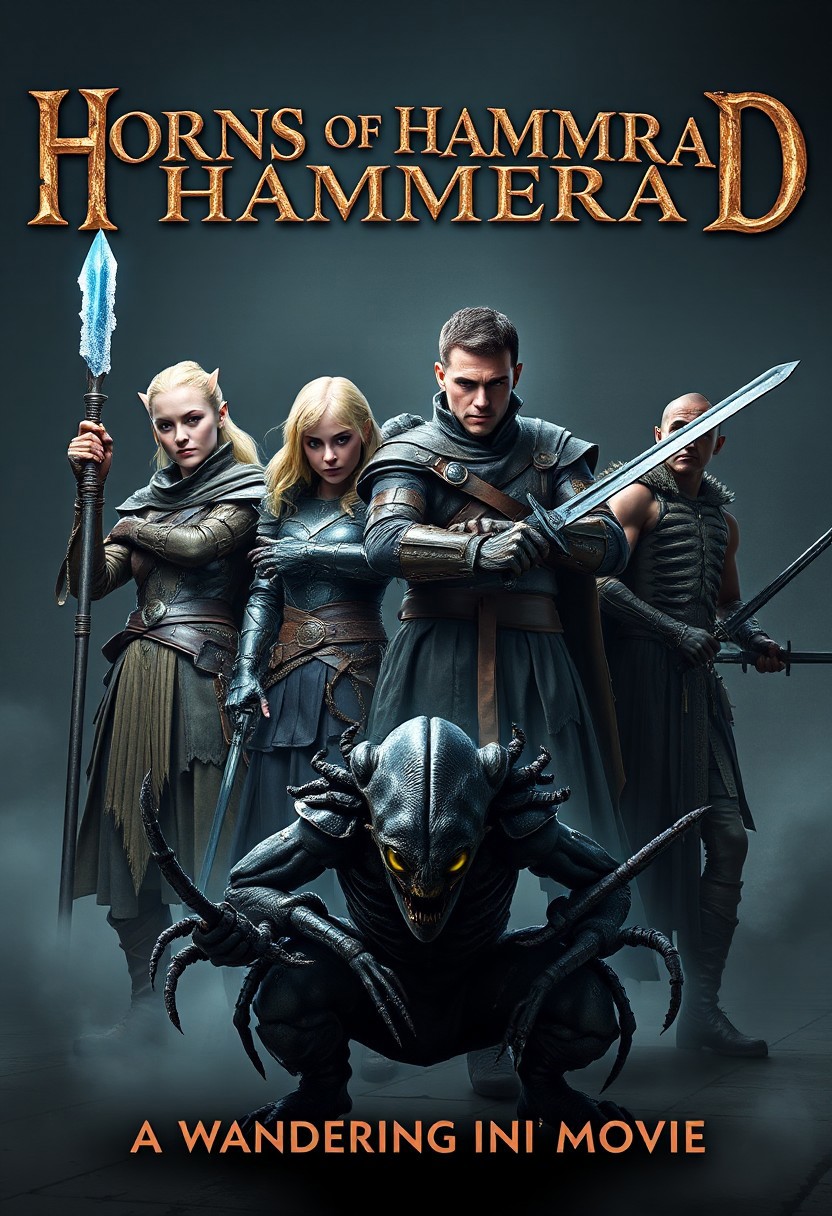 An adventure movie poster showing four adventurers ready to fight. In front stands a half-elf Cryomancer. She has pale skin, light blonde hair tied back, and sharp elven features. She wears a mix of leather armor and robes. Her skeletal arm, transformed by necromancy, is encased in magical frost, raised with frost gathering at her fingertips, and she wields an ice-blue staff. Beside her stands,a tall, muscular human woman with blonde hair and blue eyes. She is clad in heavy, custom-fitted armor with intricate designs, showcasing her noble lineage. Her metal arms, a result of a past incident, are crossed defensively, with twin swords ready. Behind them is a thin, pale young human man with dark, unkempt hair and striking blue eyes. Dressed in dark robes as a mage, he clutches a staff with one hand, while dark energy swirls from the other, his gaunt appearance. Crouched low is an Antinium with a chitinous, dark exoskeleton. His humanoid yet alien form includes multiple limbs and compound eyes that reflect light eerily. He carries multiple weapons strapped to his carapace, ready to strike, with his attempt at a human-like stance. Dim, eerie light casts long shadows as fog swirls around their feet. The viewpoint is dynamic, from a slightly low angle. The movie title arches above in ancient, worn lettering with the text 'Horns of Hammerad'. Below, in smaller lettering, it spells 'A Wandering Inn Movie'. Ultra-realistic and ultra-high detail.