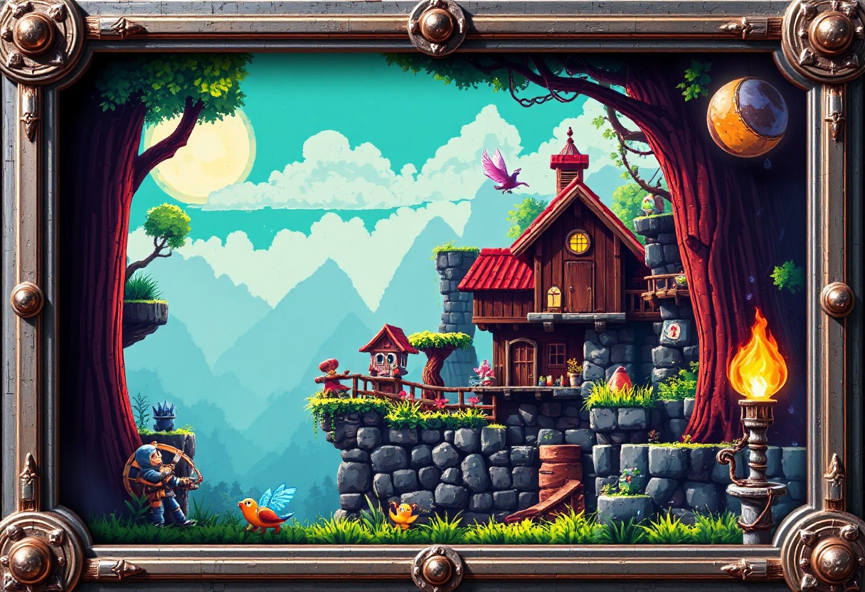 A retro-inspired pixel art animation reminiscent of classic video games from the 8-bit era, featuring charming sprites, catchy chiptune music, and nostalgic gameplay that transports viewers back to a simpler time. (masterpiece, award winning artwork) many details, extreme detailed, full of details, Wide range of colors, high Dynamic detailmaximizer,gaming, magic silver frame, bronze object