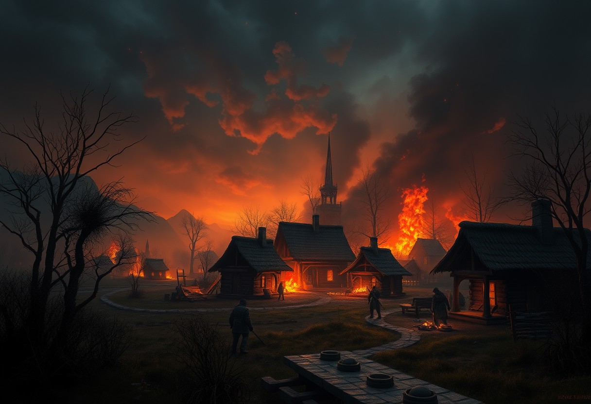 a dark fantasy burning village afer being attacked at night <lora:More_interesting_backgrounds:1> ibg, (((masterpiece))) (((ultimate quality))) sharp focus, high texture resolution, hyperrealistic, photo realistic, 32k, HDR, vivid colors, stunning compostion, soft lighting