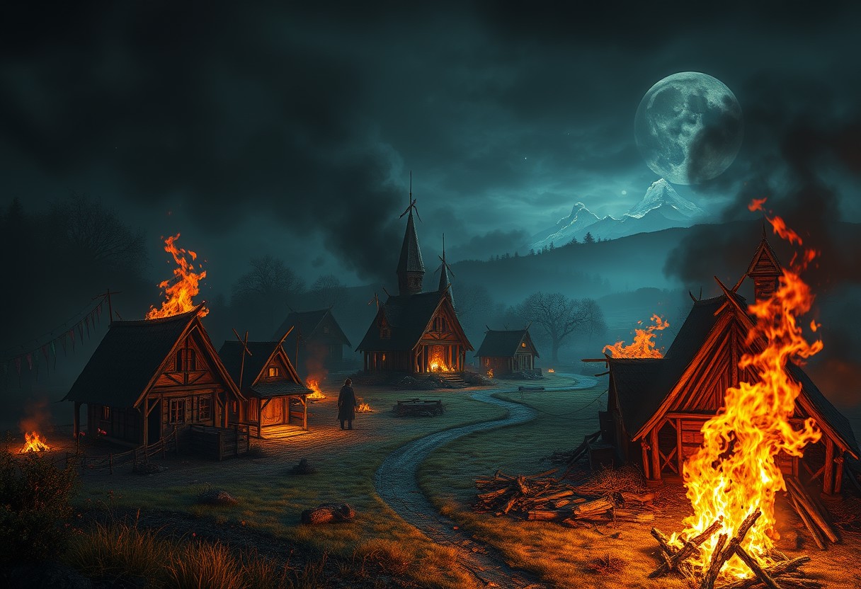a dark fantasy burning village afer being attacked at night <lora:More_interesting_backgrounds:1> ibg, (((masterpiece))) (((ultimate quality))) sharp focus, high texture resolution, hyperrealistic, photo realistic, 32k, HDR, vivid colors, stunning compostion, soft lighting