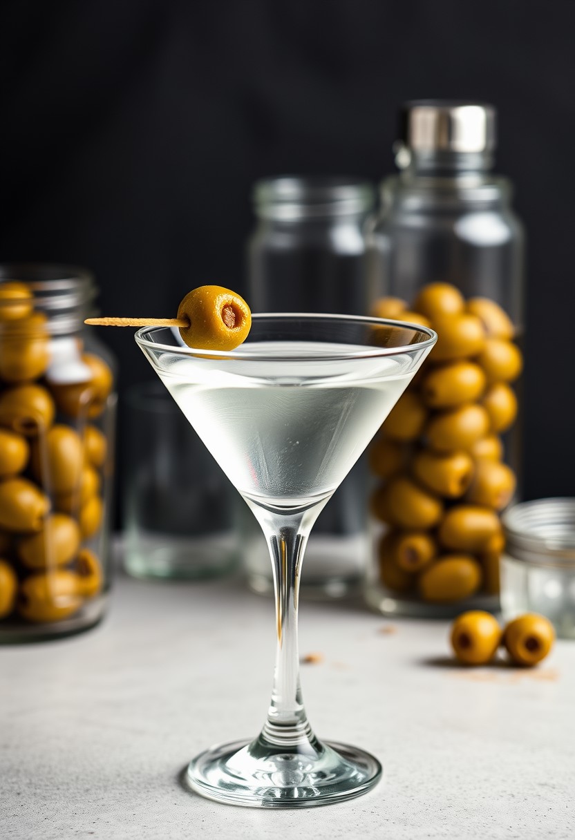 a mid shot view of two, transparent martini glasses. One glass, in the foreground, contains a clear liquid and an olive on a toothpick. In the background, there is a jar filled with olives, another glass container, and a cocktail shaker. foodstyle. This photo is used for food photography.