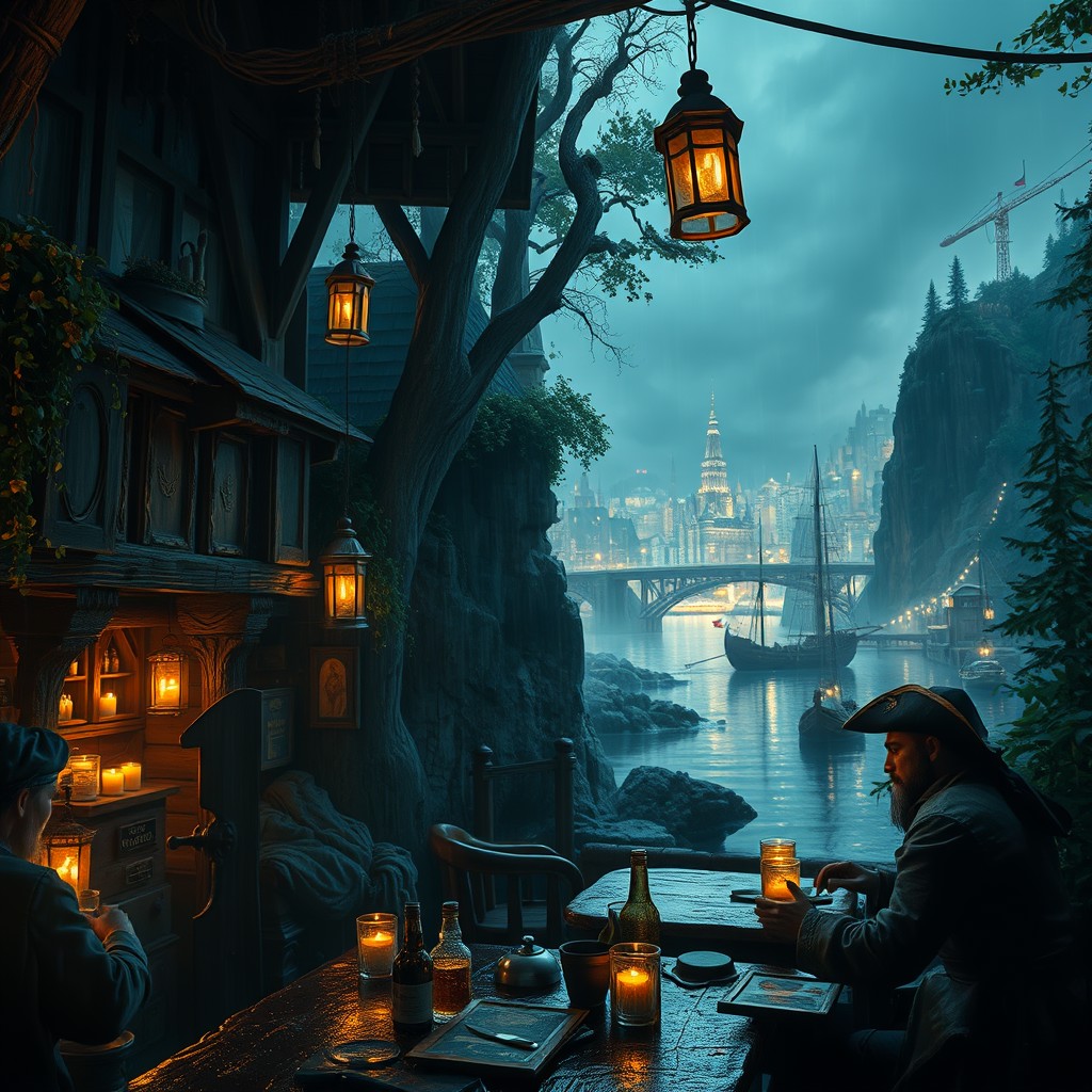 view from below, (masterpiece hyperrealisitic, medium format camera shot, fantasy oil painting, concept art 8k, high quality, detailing, textures) Imagine a spooky atmospheric perfect fantasy tavern with happy perfect hyperrealisitic pirates drinking beer, with cozy candle light, rain reflections, by the river, ( in the background a large fantasy hyperrealisitic bustling port town city metropolis sprawls), nestled between a verdant, ancient forest, encircled by cliffs and city bridges across the river used for logging, taking it to the perfect pirate ships and the crashing waves of the vast, unexplored ocean.