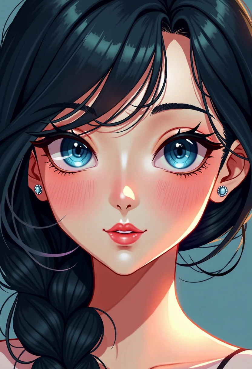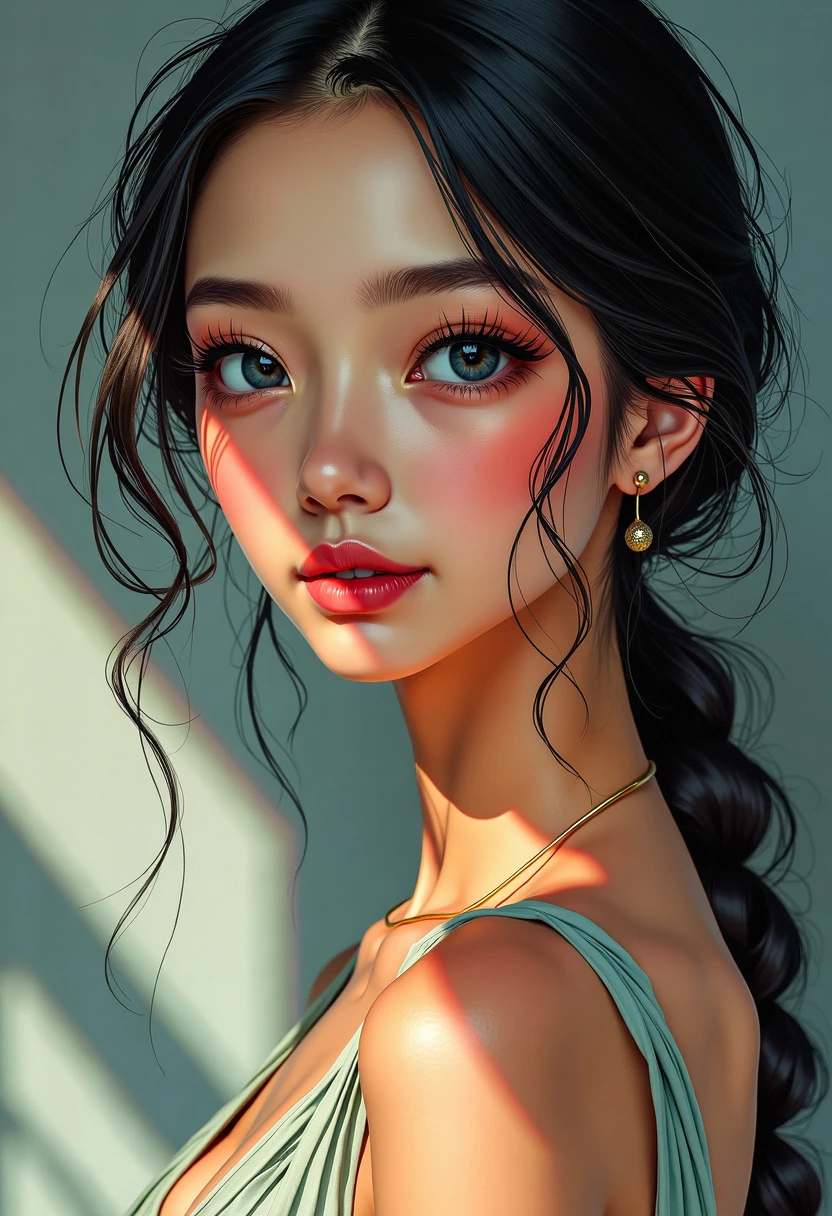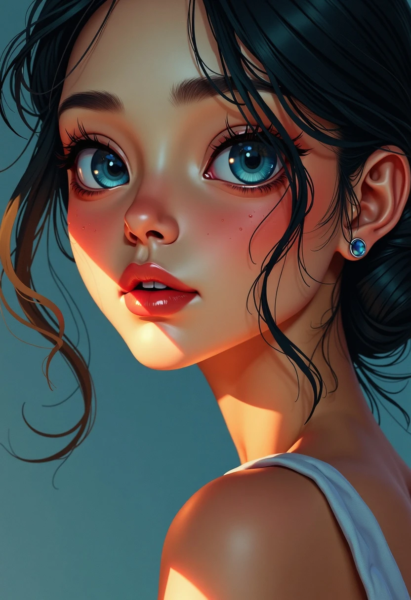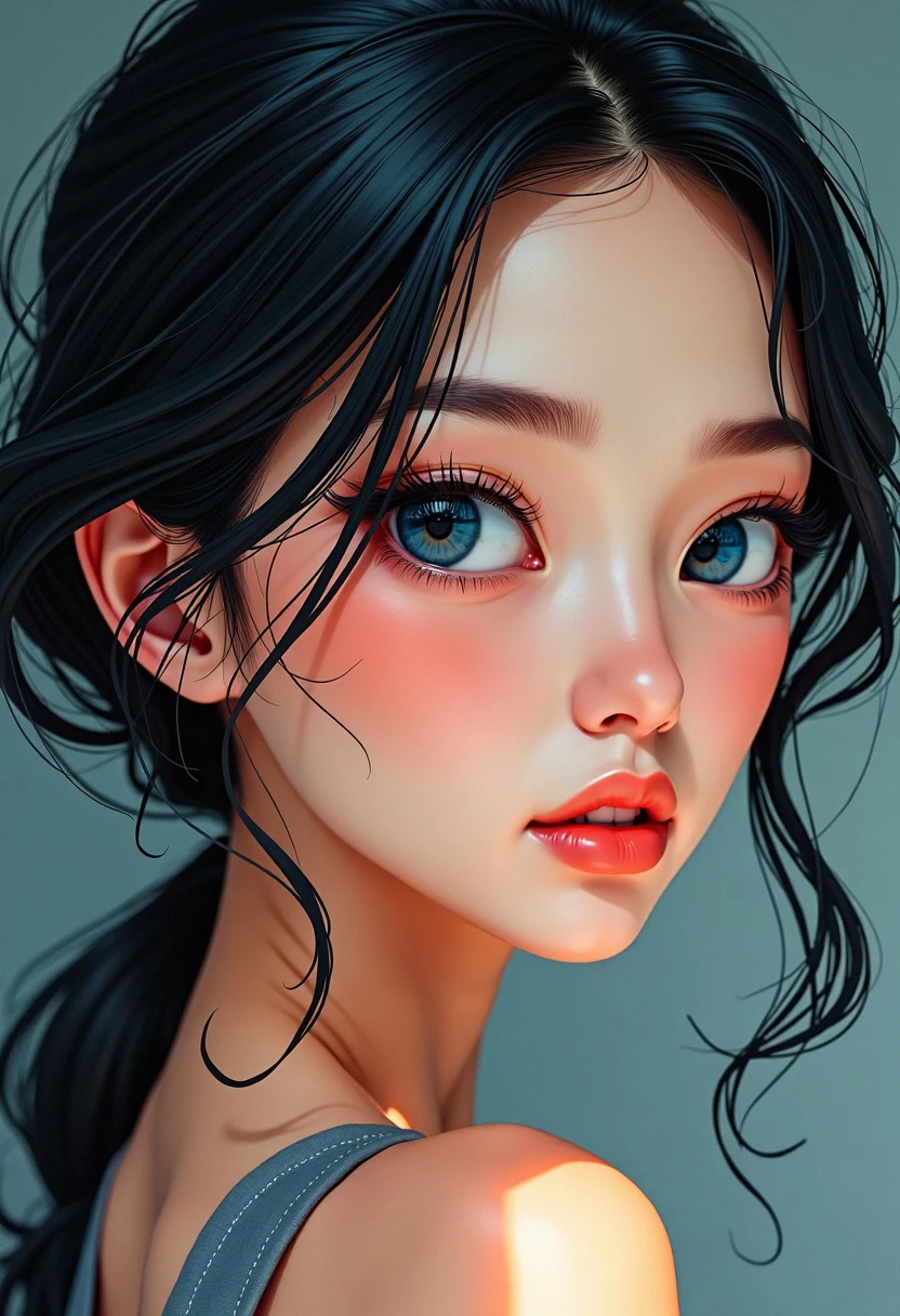 Create a portrait of upper body of a beautiful woman with a serene expression. She has large, almond-shaped eyes that are a deep, mesmerizing blue, framed by long, dark eyelashes. Her eyebrows are perfectly arched and delicate, adding grace to her gaze. Her skin is flawless, with a soft, natural glow, Her lips are full and slightly parted, revealing a hint of a gentle smile, with a natural rosy hue. Her nose is small and perfectly proportioned to her face. The overall mood is one of calm and introspective beauty. The art style should be hyper-realistic, capturing every minute detail, with a soft, diffused lighting that highlights the texture of her skin and the depth of her expression, reminiscent of classical portrait paintings but with a modern, cyberpunk twist.