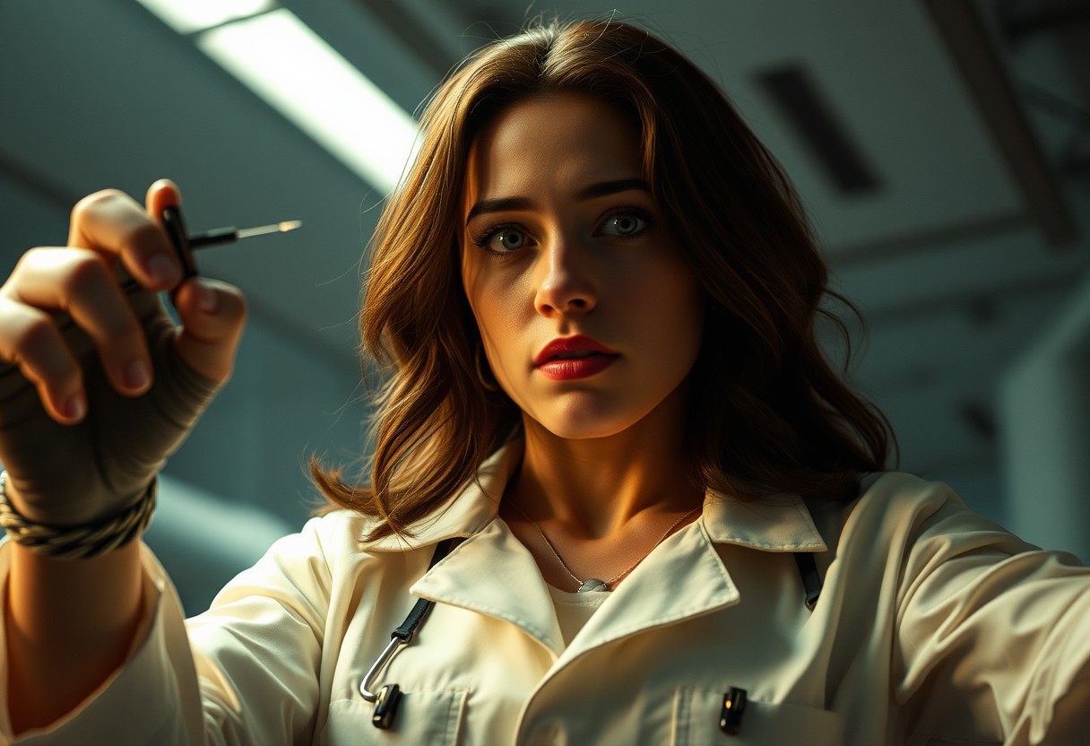 Ada, a female scientist who, in a moment of desperation, injects herself with an experimental serum she had been working on. The serum has a transformative effect, causing her body to grow stronger and more muscular at an alarming rate. Ada's muscles swell and her physical power increases dramatically, transforming her into a towering, seven-foot-tall figure with unparalleled strength.