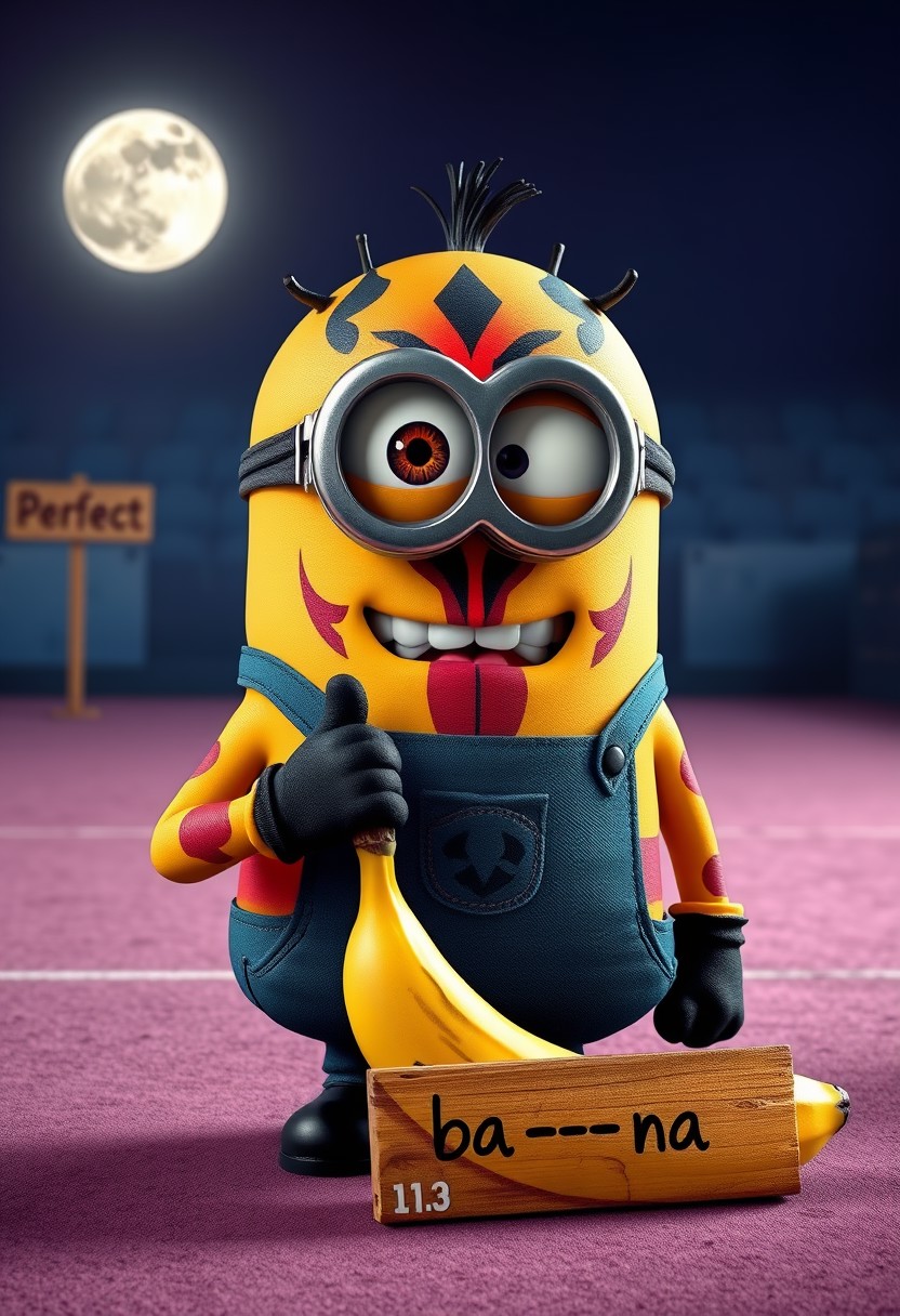 A minion from despicable me, multicolor striped skin, Darth Maul like tattoo, dressed as a italian tennis player Jannik sinner , (one eye:1.2), funny expression, (looking at viewer:1.1), revolutionary look. holding a tennis banana, pitch pastel background only illuminated by moon, wooden sign "ba - na - na" perfect banana, banana pointed at viewer, Highest quality, masterpiece, 4k, concept art,