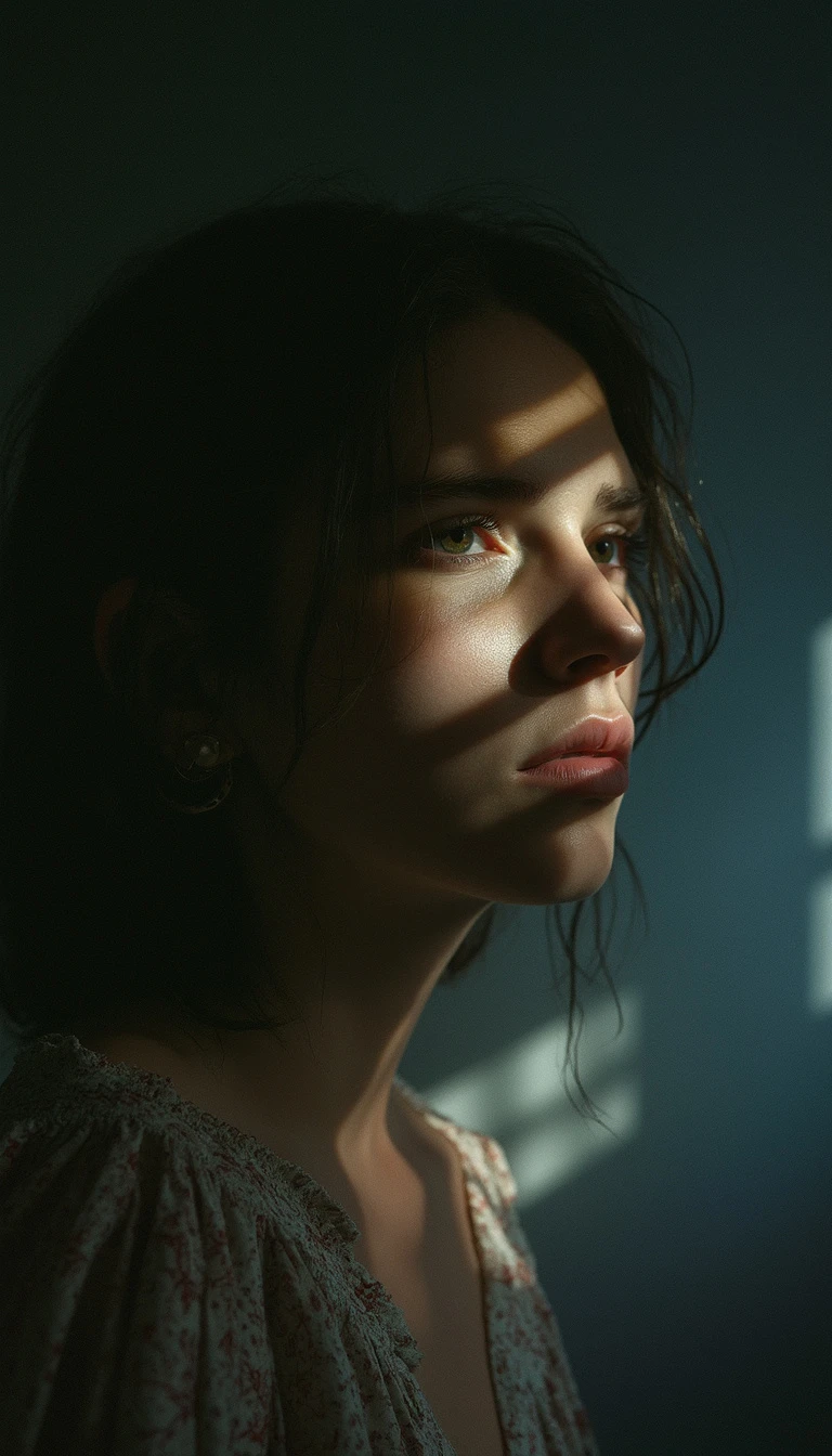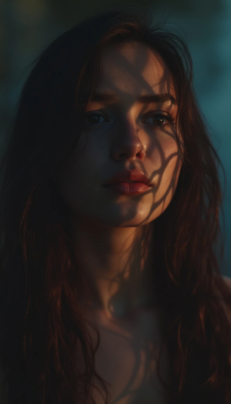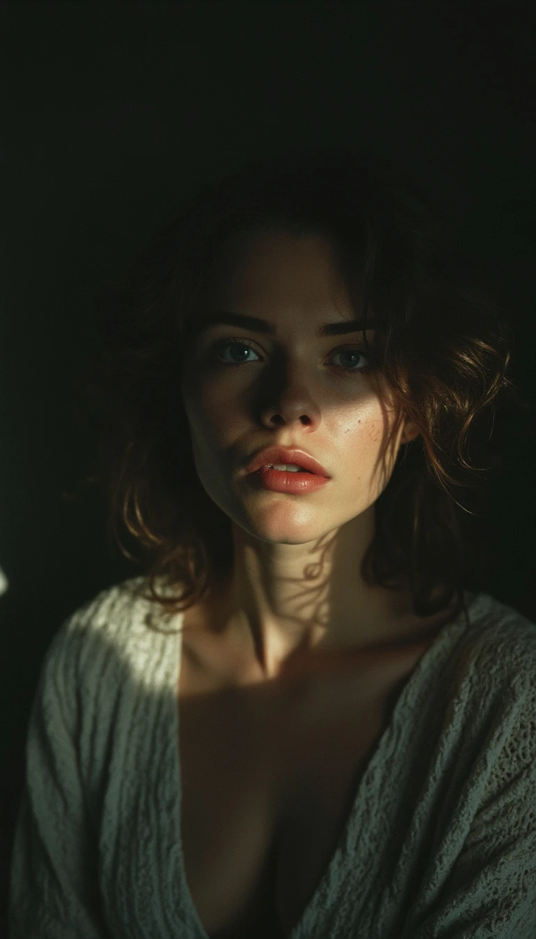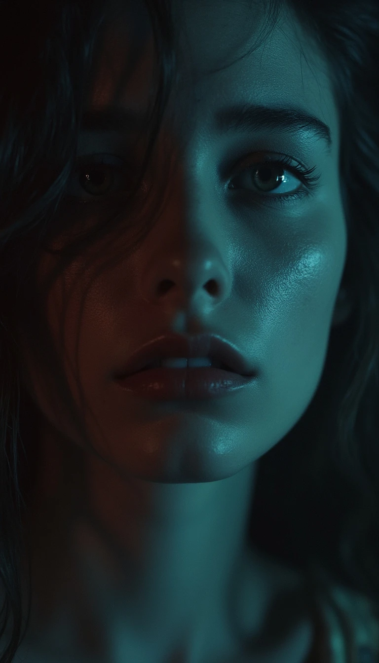 Movie still lomography, photo of beautiful woman, shadow on face, no light, misty, night