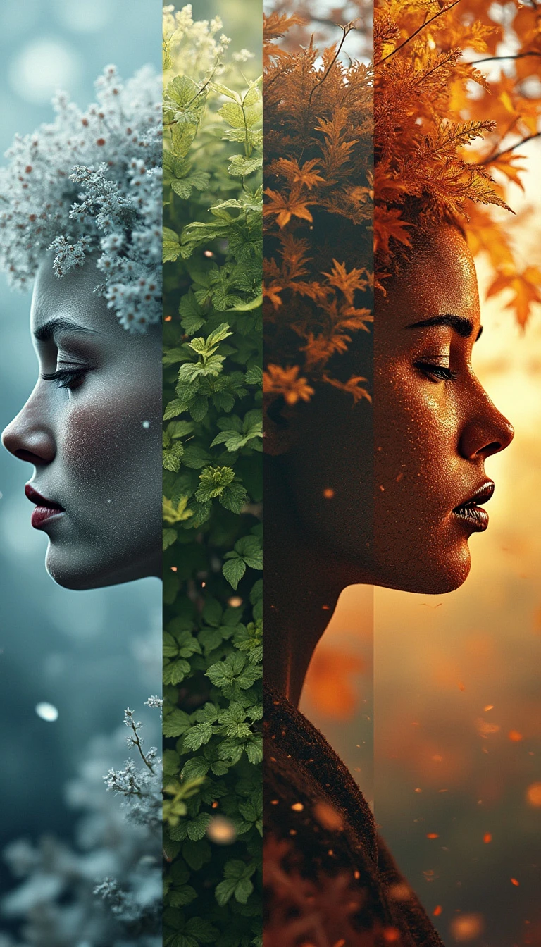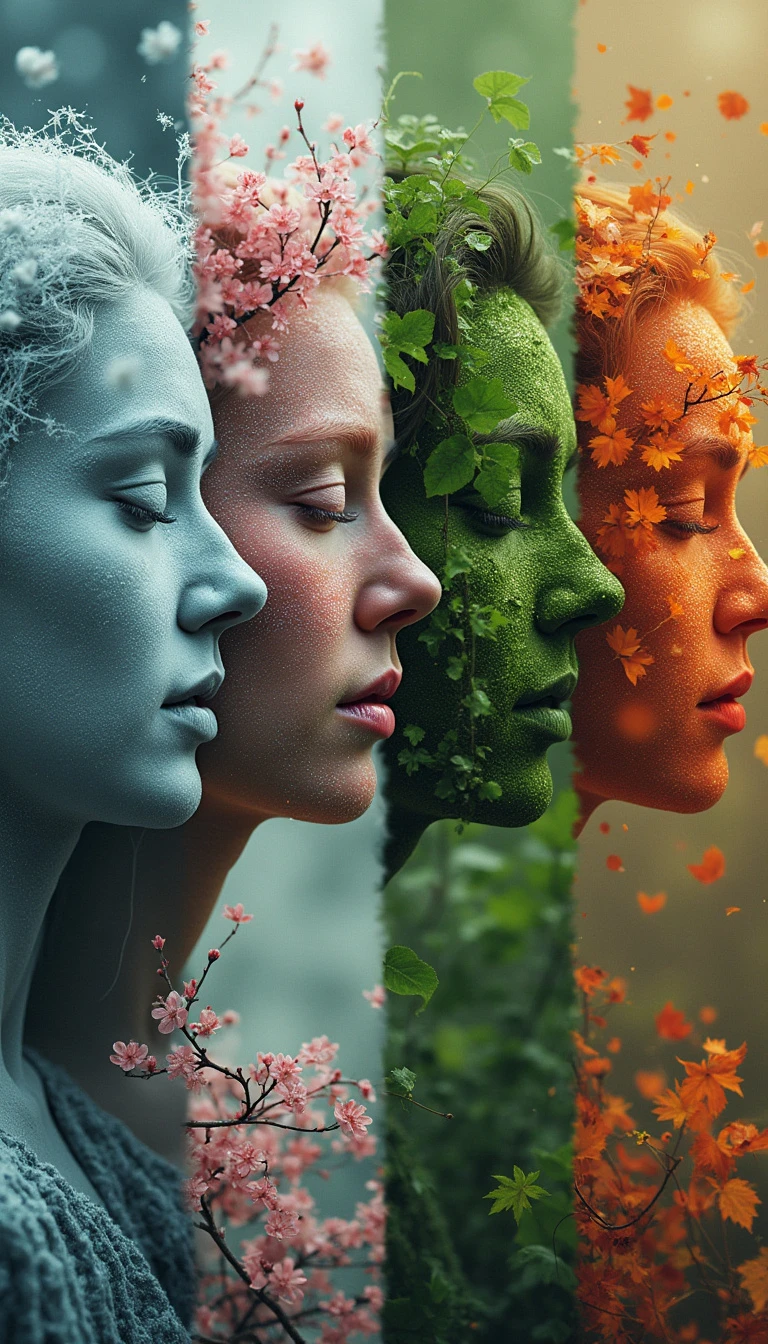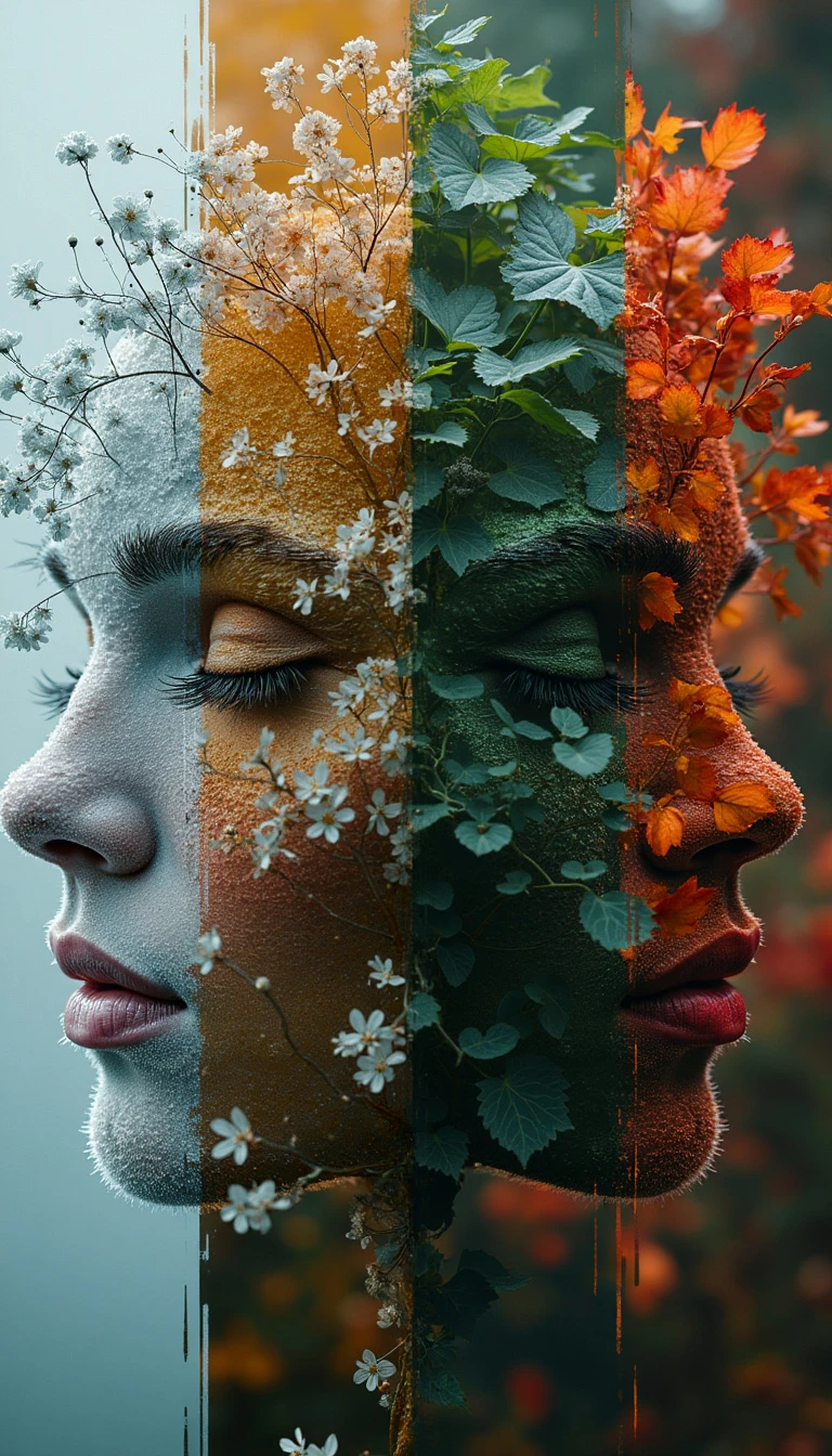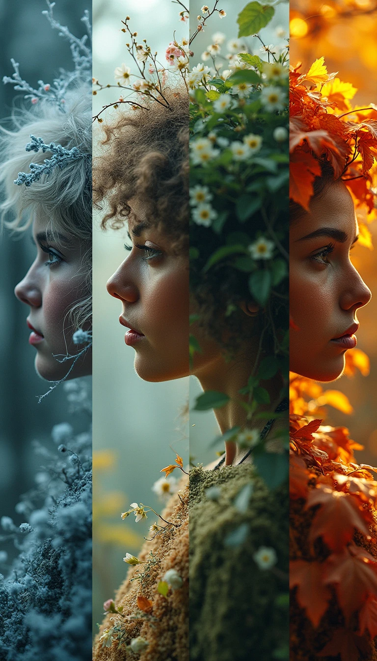 Hyper-realistic glitchcore surrealism: four razor-sharp vertical splits depicting seasons. Frosty crystalline winter, delicate pastel spring blossoms, lush verdant summer foliage, fiery autumn leaves. Double-exposed close-up silhouette with intricate digital artifacts. Ultra-high-resolution grain texture. Moody chiaroscuro lighting. Time's relentless march personified.
