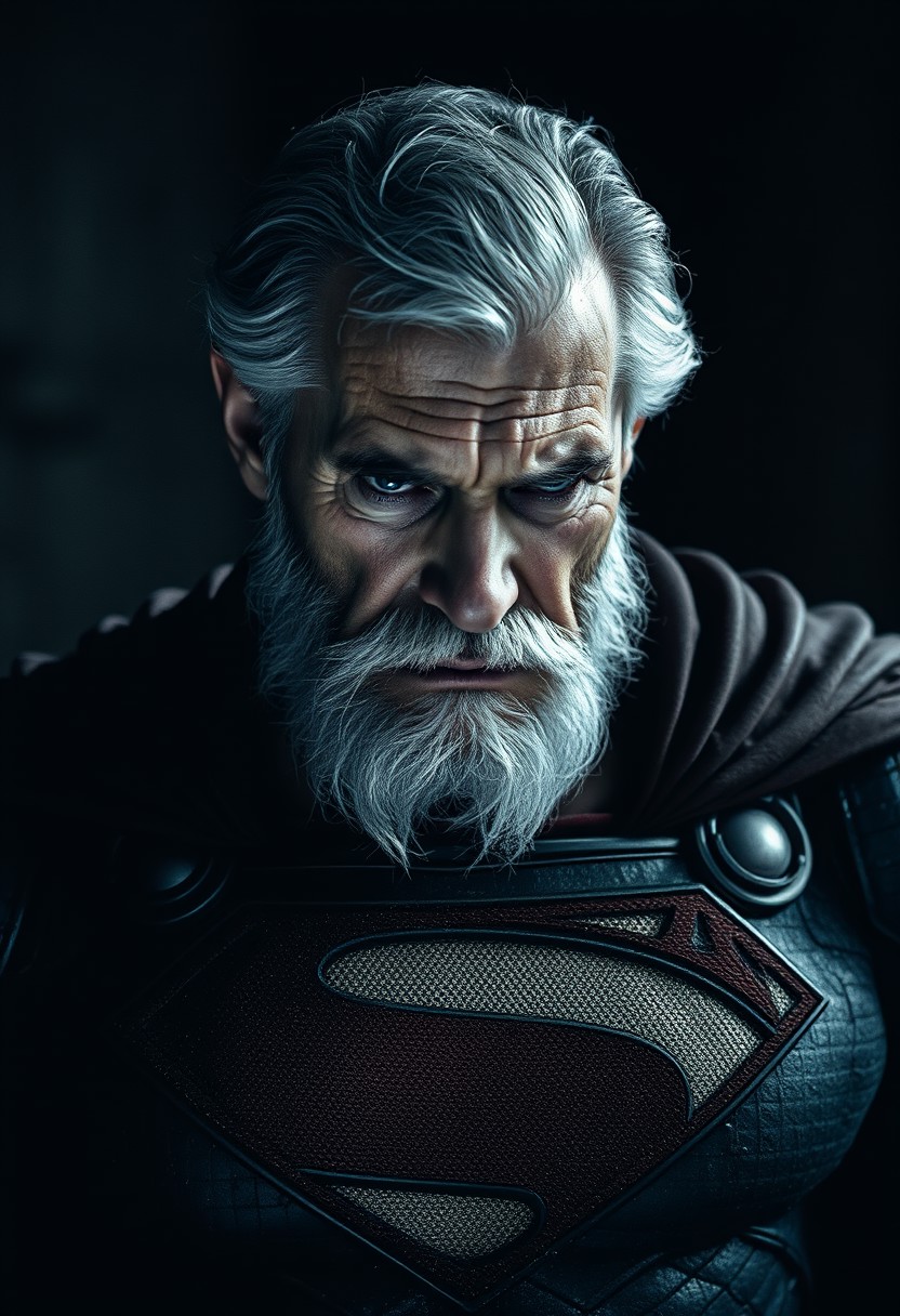DARK movie still, heavy Film grain, monochrome with Low Key color Highlights, A dystopian DARK villain Photo Portrait of old Superman, outworn Cape and armored suit, rough skin, skin Details, beard, outworn, White hair, White beard, in pain, dust, dirt, gritty, Film Noir Style, high contrast, deep blacks, vibrant blue Pop art elements,