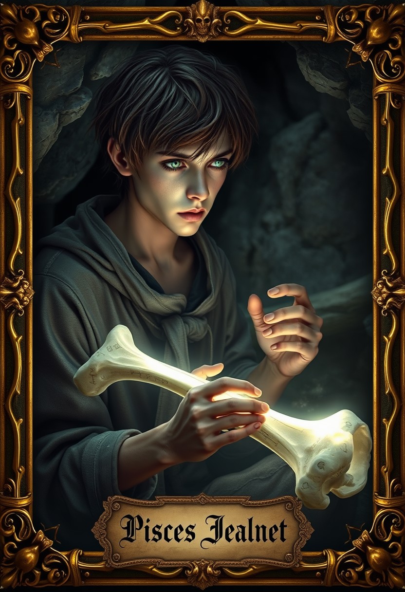 a highly detailed and magnificent image of A young man, Pisces Jealnet, with a thin build, pale skin, and brown, unkempt hair. His eyes are a nebula like blend of grey and green. He is wearing plain and dirty grey robes. He is seated in a dimly lit cave surrounded by shadows. He is focused intently on a femur bone, inscribing glowing runes into them with precise movements. The runes emit a soft, eerie light that illuminates his concentrated expression and the surrounding cave walls. The scene captures a mystical and ominous atmosphere, with an aura of dark magic enveloping the bones. The image is set within an ornate golden frame, intricately detailed with bone designs and magical motifs. At the bottom of the frame, there is a name plaque that reads “Pisces Jealnet” in elegant script.