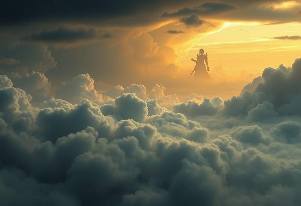 epic fantasy landscape, apocalyptic clouds in the distance, a storm is approaching, the silhouette of a giant goddess can be seen on the horizon, giantess, silhouette of a gigantic goddess in the background, barely visible, body half-hidden in the clouds, body made of clouds, thick curvy busty,
