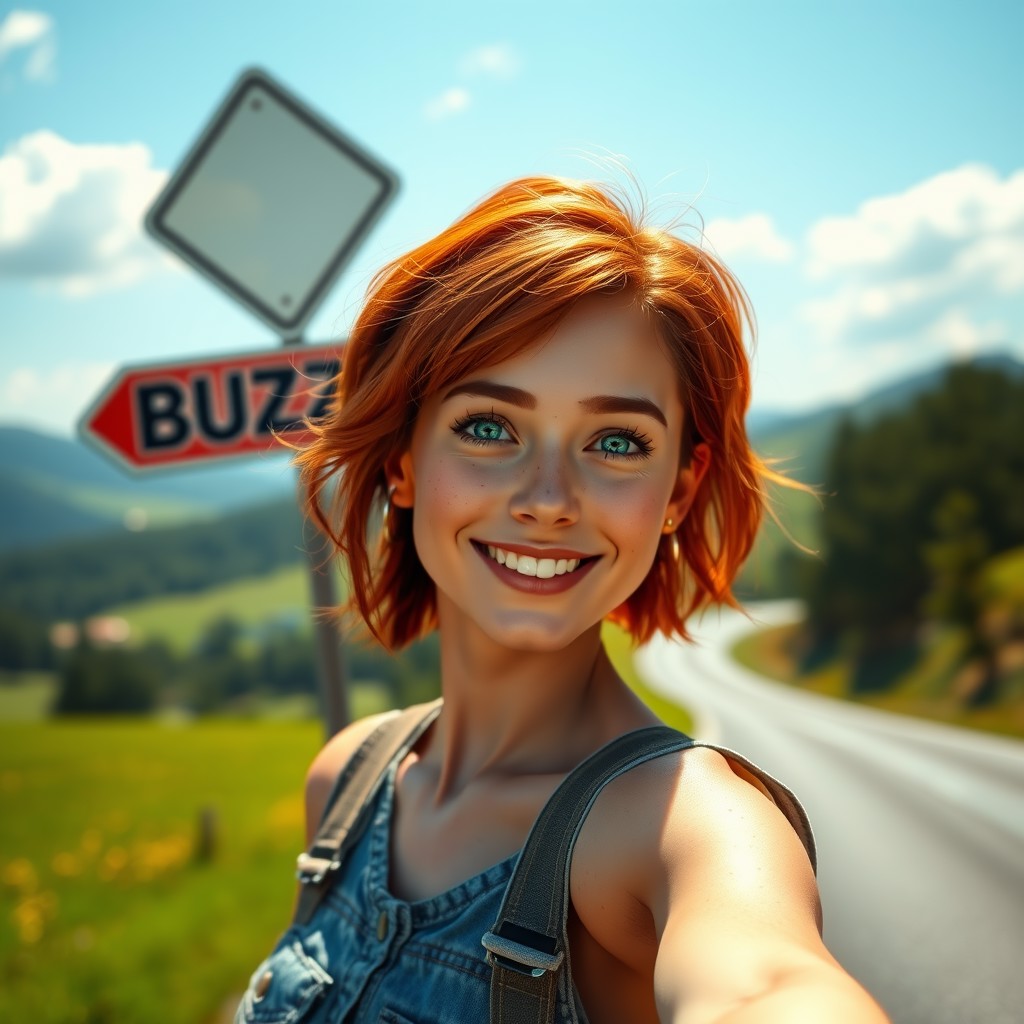 (young woman:1.3), (short red hair:1.2), charming freckles, (bright green eyes:1.4), casual attire, (hitchhiking:1.8), confident smile, (sign "BUZZ":2.0), (sunny road:1.3), gentle hills, lush fields, (atmosphere of freedom:1.4), anticipation, sunlight, vibrant colors, (adventure:1.5), photorealistic, (ultra-detailed:1.5), (hyper-realism:1.6), (natural lighting:1.4), (realistic skin texture:1.5) <lora:Flux:1>
