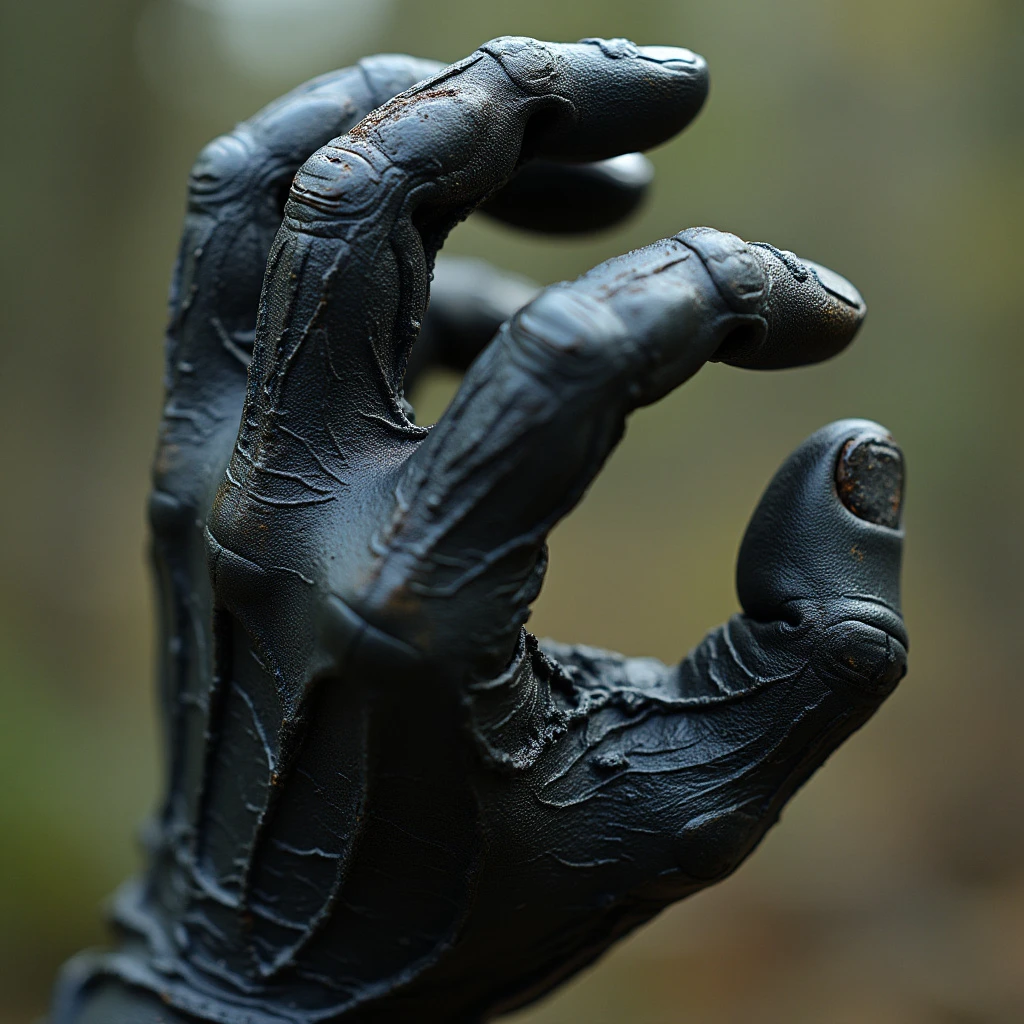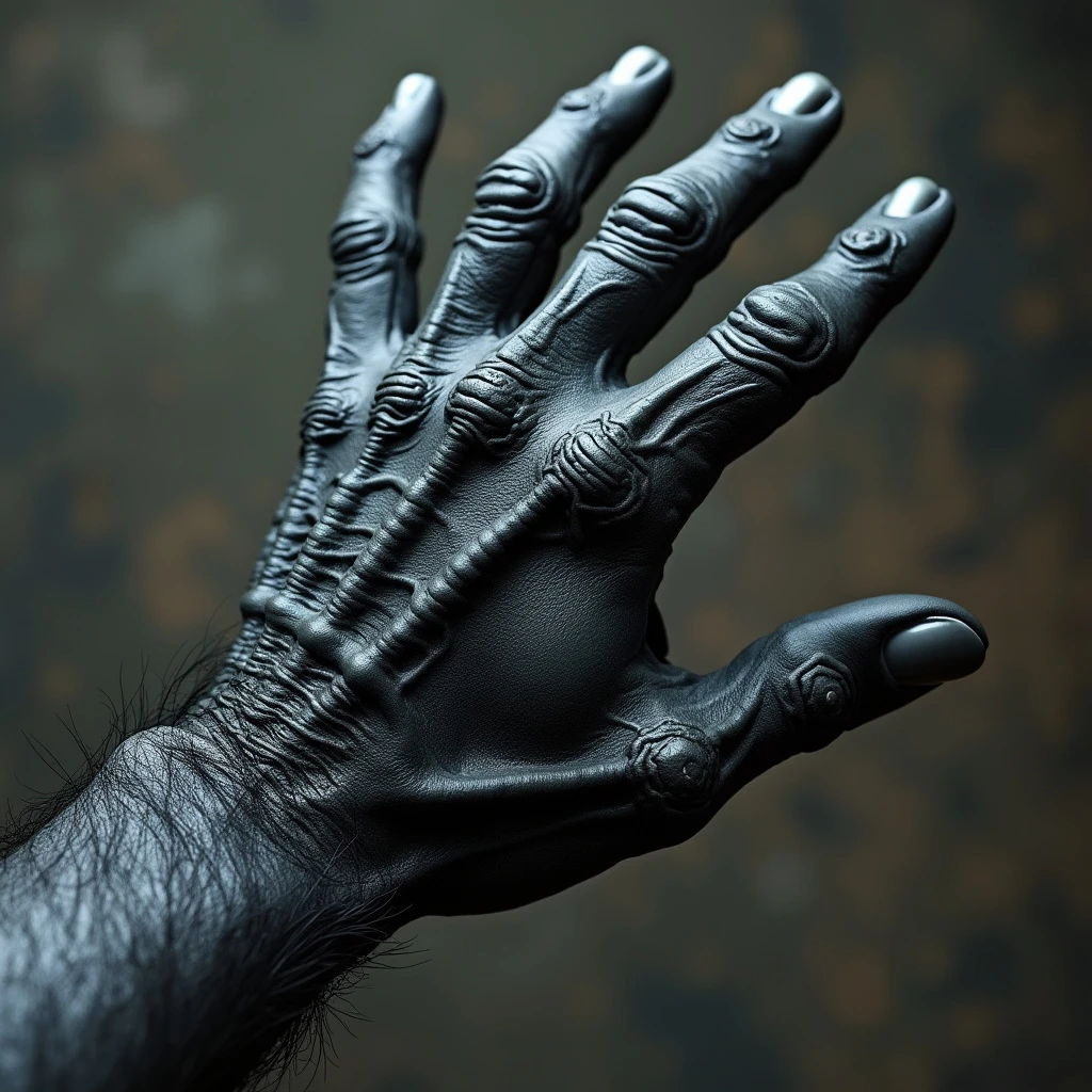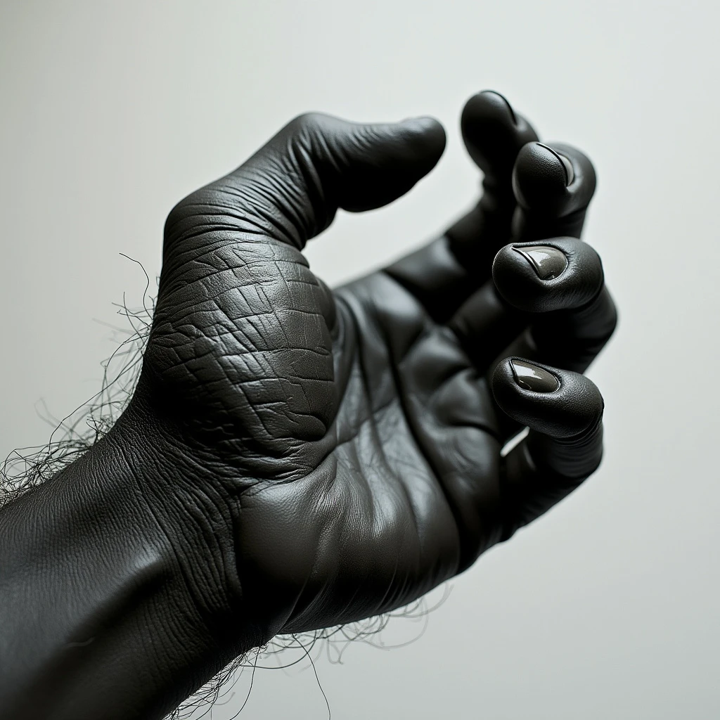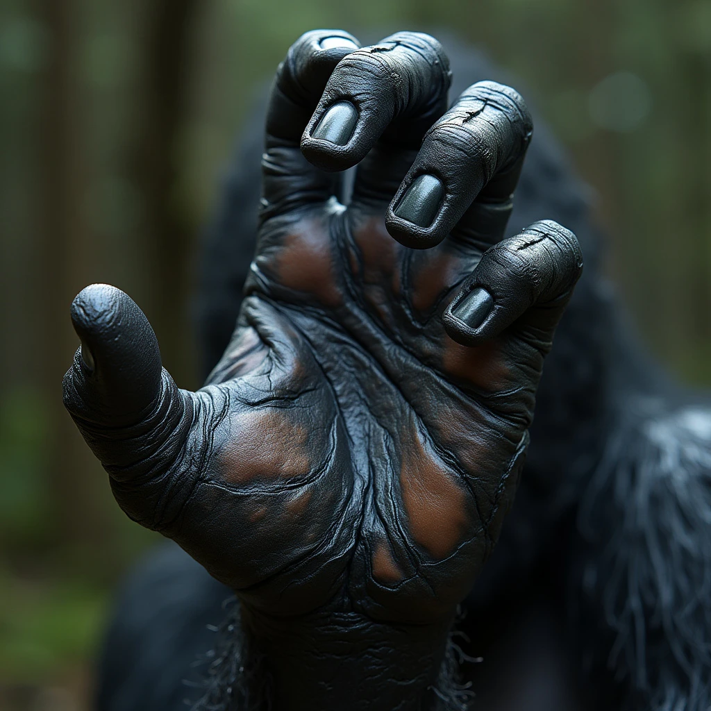 picture of a close-up of a human hand. the hand is completely black and mutated and looks like a hybrid of human and gorilla.