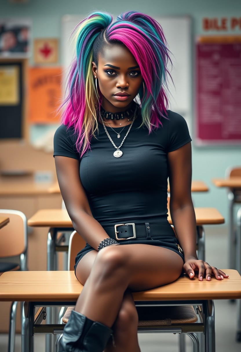 photo, realistic, ultra high quality, 8k, beautiful black supermodel, beautiful punk girl with colourful hair, striking bone structure, high cheekbones, elegant jawline, full lips, large eyes, sexy, incredibly beautiful woman, massively huge breasts, scornful look, punk attire, skintight clothes, knee high boots, sitting casually in a classroom, bratty