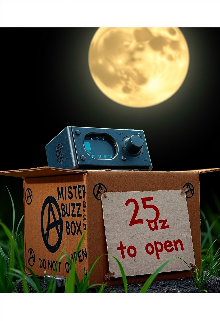 buzz machine, a cardboard box, little ruined, with anarchy symbols on sides, having written "MISTERY BUZZ BOX DO NOT OPEN", second cardboar WITH "25 buzz to open" (in red) , full moon in background illuminate the scene, few long blades of acid green grass