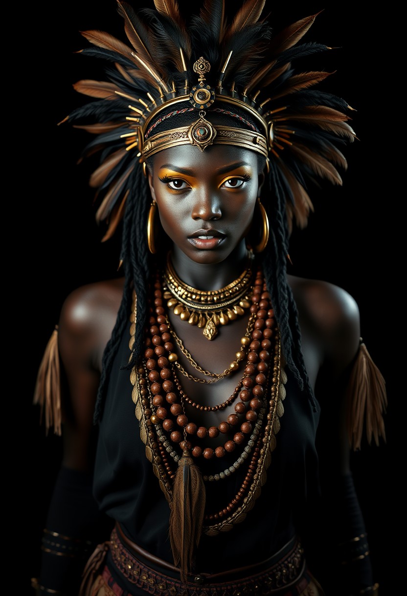 full shot, standing pose, front view of a Beautiful african warrior queen, tribal armour,feathers, tribal necklaces, tribal sandals, black skin, golden makeup, sensual, erotic, sensual lips, flirty look on face, black clothes, Low saturation color photography, vintage, grunge, top light, masterful piece in the style of Oleg Dou photography, black background