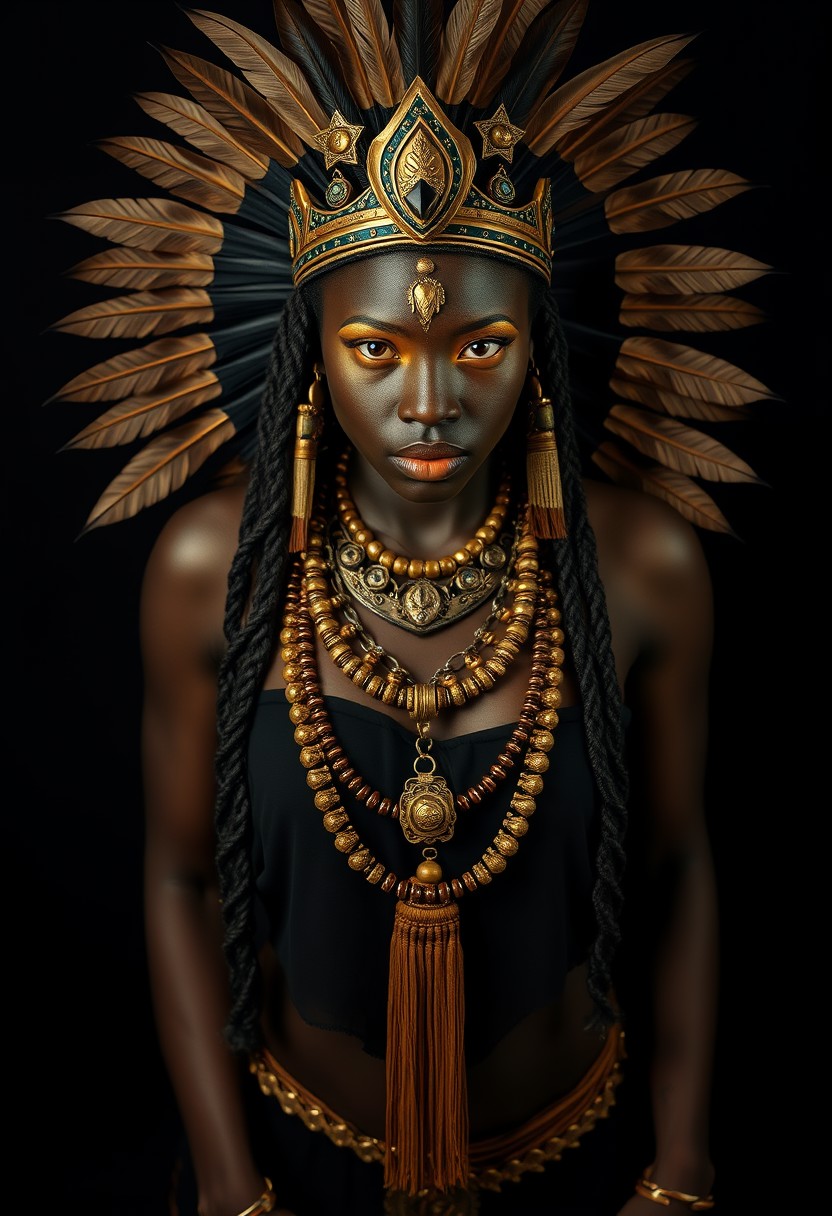 full shot, standing pose, front view of a Beautiful african warrior queen, tribal armour,feathers, tribal necklaces, tribal sandals, black skin, golden makeup, sensual, erotic, sensual lips, flirty look on face, black clothes, Low saturation color photography, vintage, grunge, top light, masterful piece in the style of Oleg Dou photography, black background