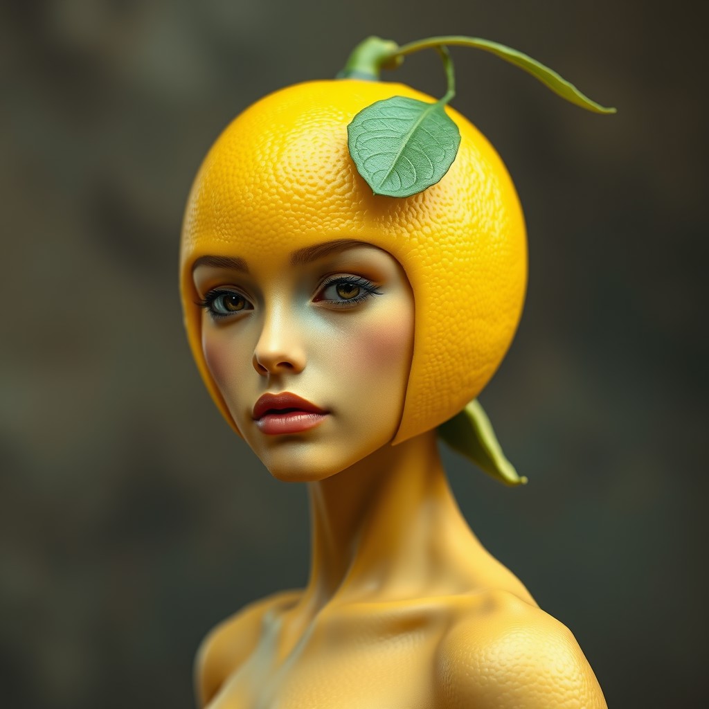 A humanoid lemon with a lemon shaped head that otherwise has regular facial features, her skin has the same texture and colour as a lemons skin, her body is considered sexy by human standards, enchanting, fantasy vibes