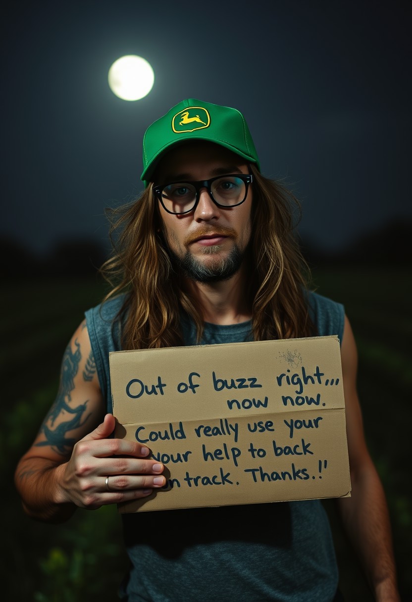 a vagabond farmer, intoxicated, drunk. glasses john lennon style, long hairs, tattoo. green "john deere" trucker cap. holding a cardboard with written "Out of buzz right now—could really use your help to get back on track. Thanks!" dark halley light only from the full moon in bk