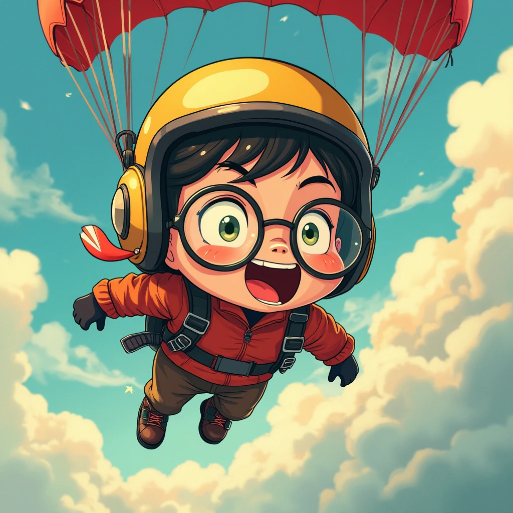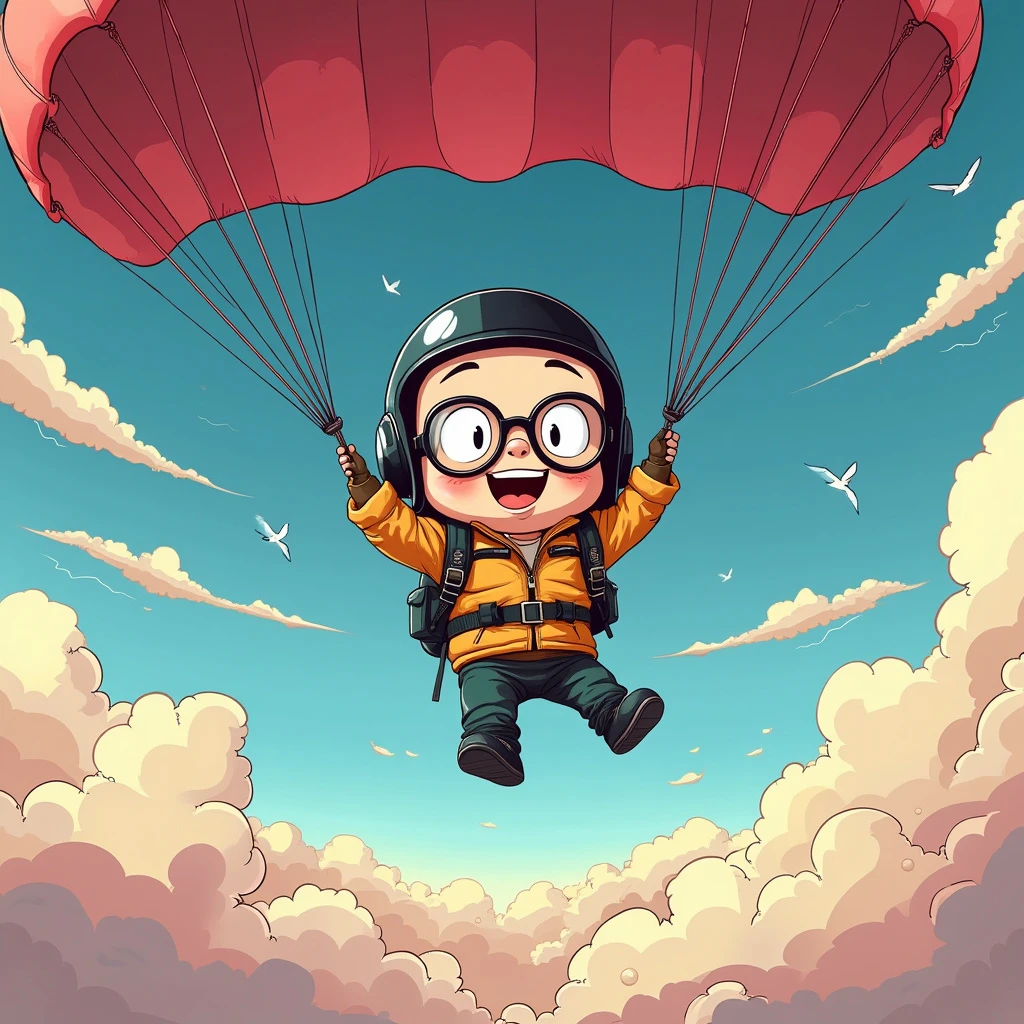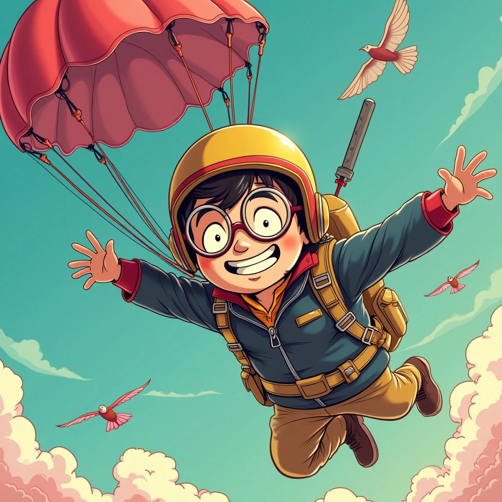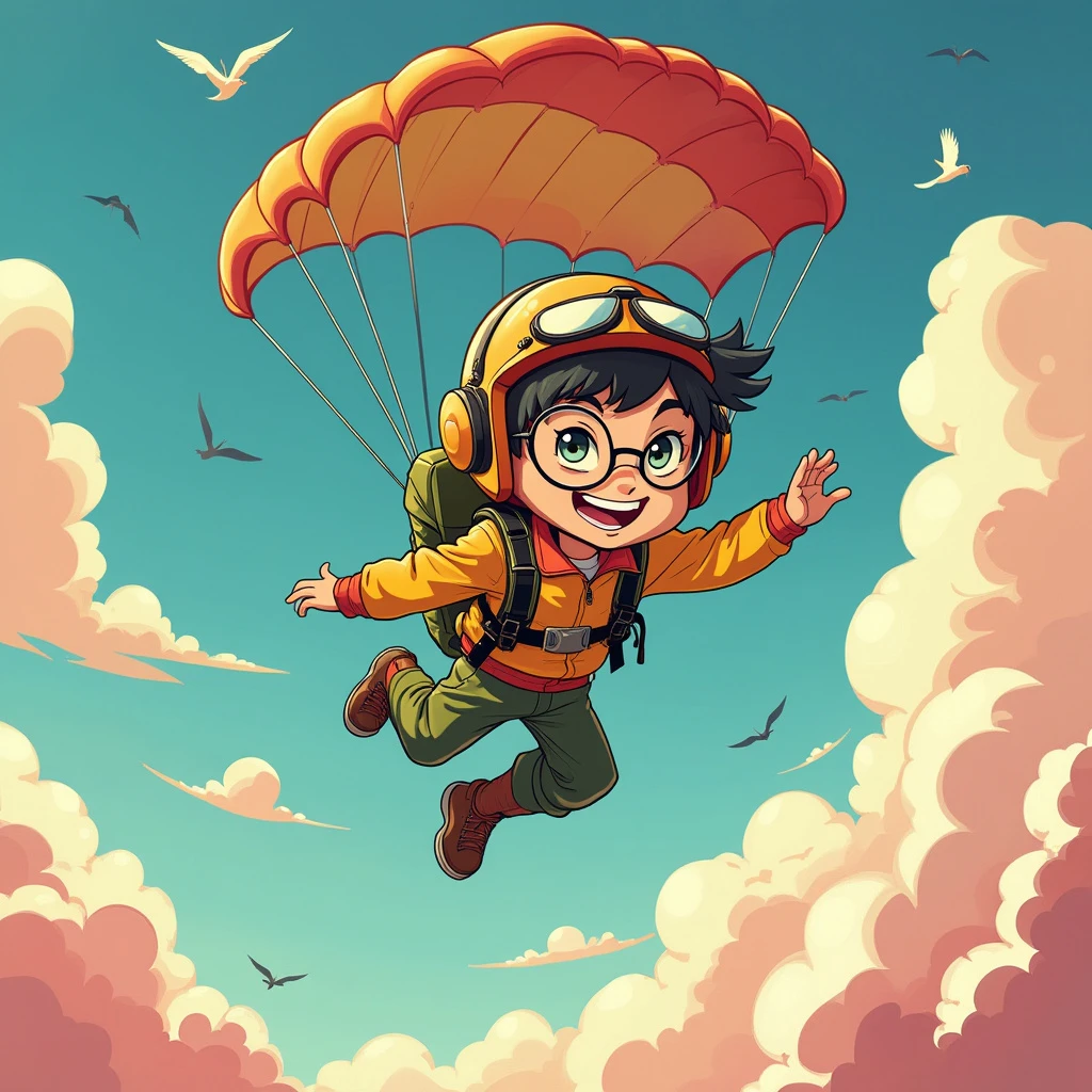 Design a cheeky and humorous movie poster for a satirical comic character Jojo, who is a playful parody of a familiar children’s cartoon, wearing jacket and helmet . Jojo is a parachute jumper, depicted in a cartoon style with exaggerated features, wearing oversized eyeglasses and a mischievous grin, is falling down with parachute in windy environment . The scene is set in a whimsical, exaggerated sky scene with bright, bold colors—lots of pinks, reds, and yellows. The background features cartoonish sky elements, like clouds, birds but with hidden, suggestive shapes that add a layer of humor for those who notice. The poster is designed to be provocative yet clever, aimed at generating laughs and conversation while maintaining a playful, cartoonish style.