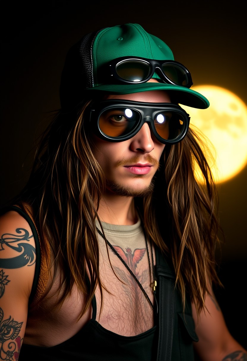 cardboard "Out of buzz right now—could really use your help to get back on track. Thanks!" by side a vagabond, intoxicated, drunk. Goggles john lennon style, long hairs, tattoo. green trucker cap. dark halley light only from the full moon in bkg