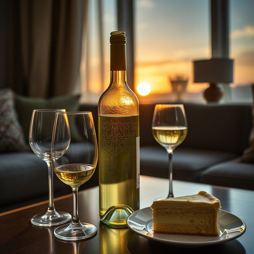 still life photo of a half empty bottle of white wine and three half-filled wine glasses on a living room side table, there is white wine around the bottom of both the glass and bottle. sunset is visible through the window in the background shallow focus, one side lighting, dramatic lighting, (( a small plate with vanilla cake near the white wine bottle)),