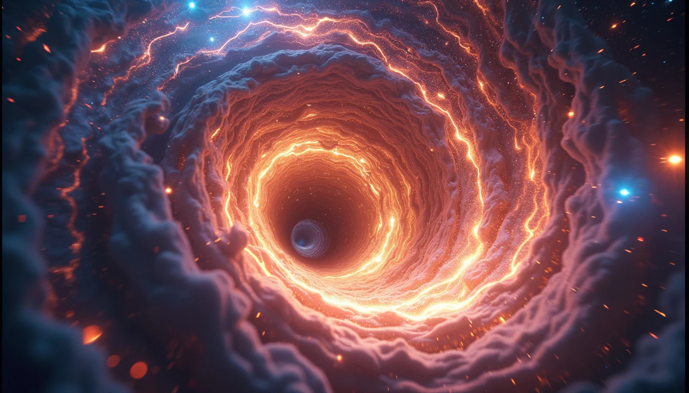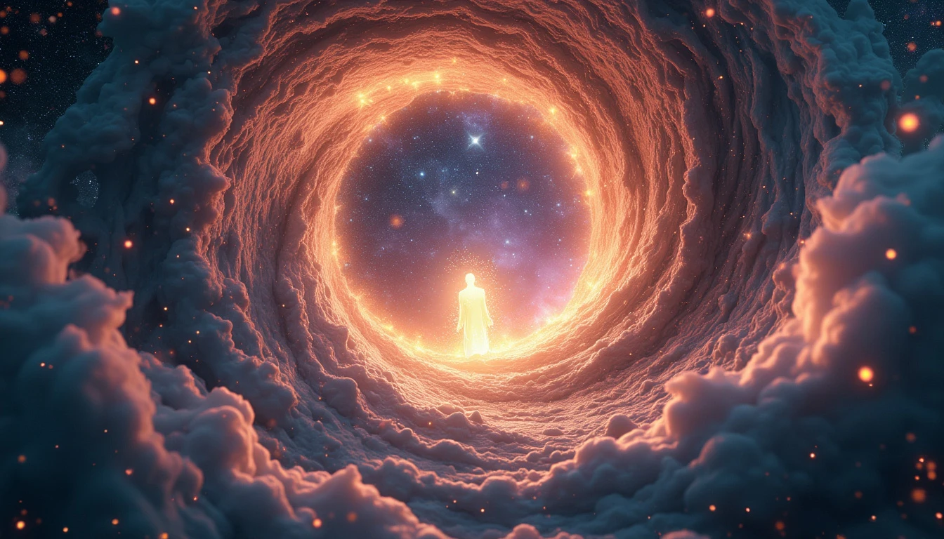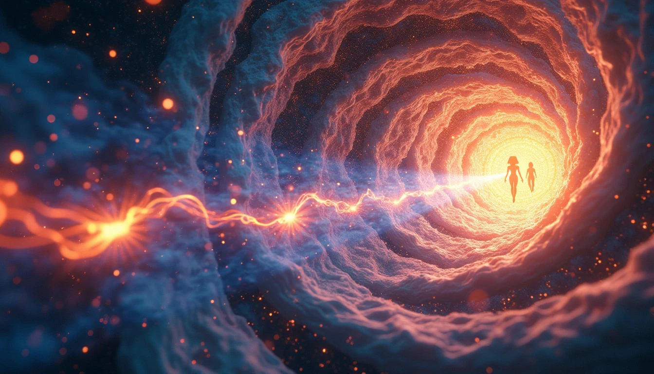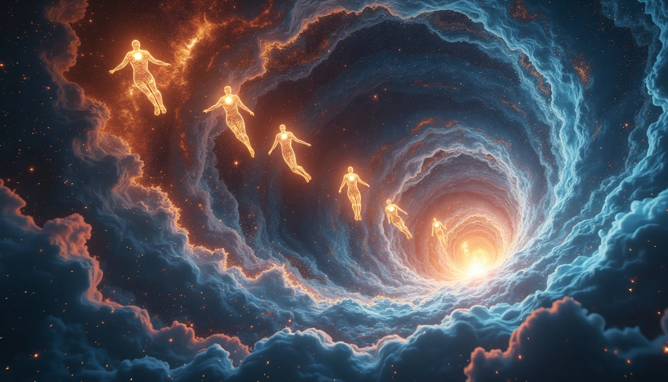 Cosmic vortex with swirling energy, ethereal human-shaped souls flying towards the center, glowing energy beings drawn into a spiraling black hole, luminous spirit forms streaming into a galactic whirlpool, vibrant soul essences entering an interdimensional portal, celestial maelstrom pulling radiant human silhouettes, starry background, intense light from the vortex core, dynamic motion lines, 8k resolution, highly detailed, cinematic lighting, space art