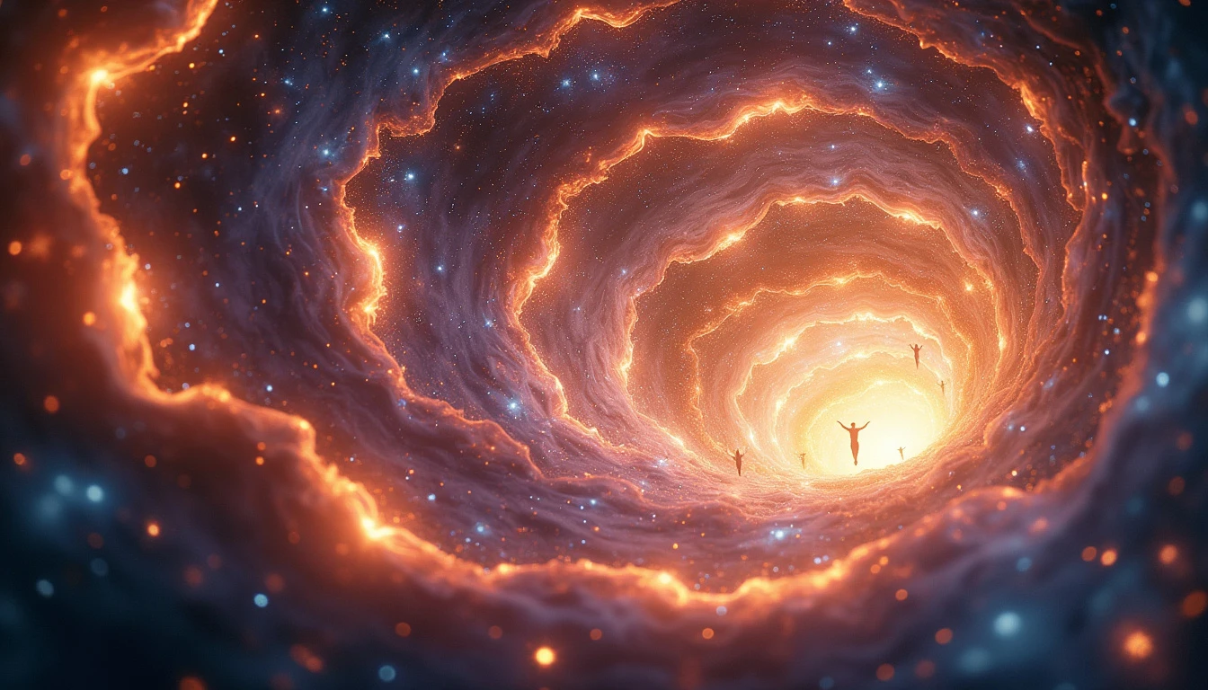 Cosmic vortex with swirling energy, ethereal human-shaped souls flying towards the center, glowing energy beings drawn into a spiraling black hole, luminous spirit forms streaming into a galactic whirlpool, vibrant soul essences entering an interdimensional portal, celestial maelstrom pulling radiant human silhouettes, starry background, intense light from the vortex core, dynamic motion lines, 8k resolution, highly detailed, cinematic lighting, space art