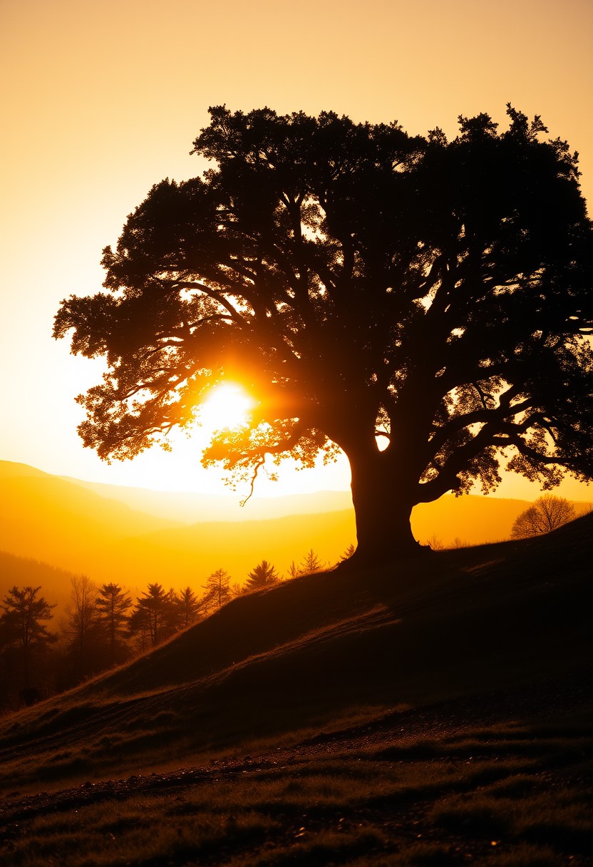 Autumn. Sunset over a mountain landscape. A huge oak tree standing on a hillside, many acorns under the oak, golden light of the setting sun. The sky is a gradient of soft orange and yellow tones merging with the horizon. The exposure is perfectly balanced, emphasizing the natural beauty and tranquility of the landscape. highly detailed and hyper realistic photo, by Alena Aenami , by Archibald Thorburn , by Daniele Afferni , in the style of monochromatic silhouette reflection, limited dark palette, unusual dark colors, faded colors, atmospheric haze, highly dramatic cinematic lighting, motion blur, film grain, professional, excellent composition, finest details, maximized details, ultimate detail level, masterpiece, best quality