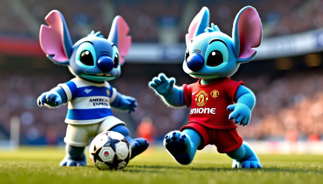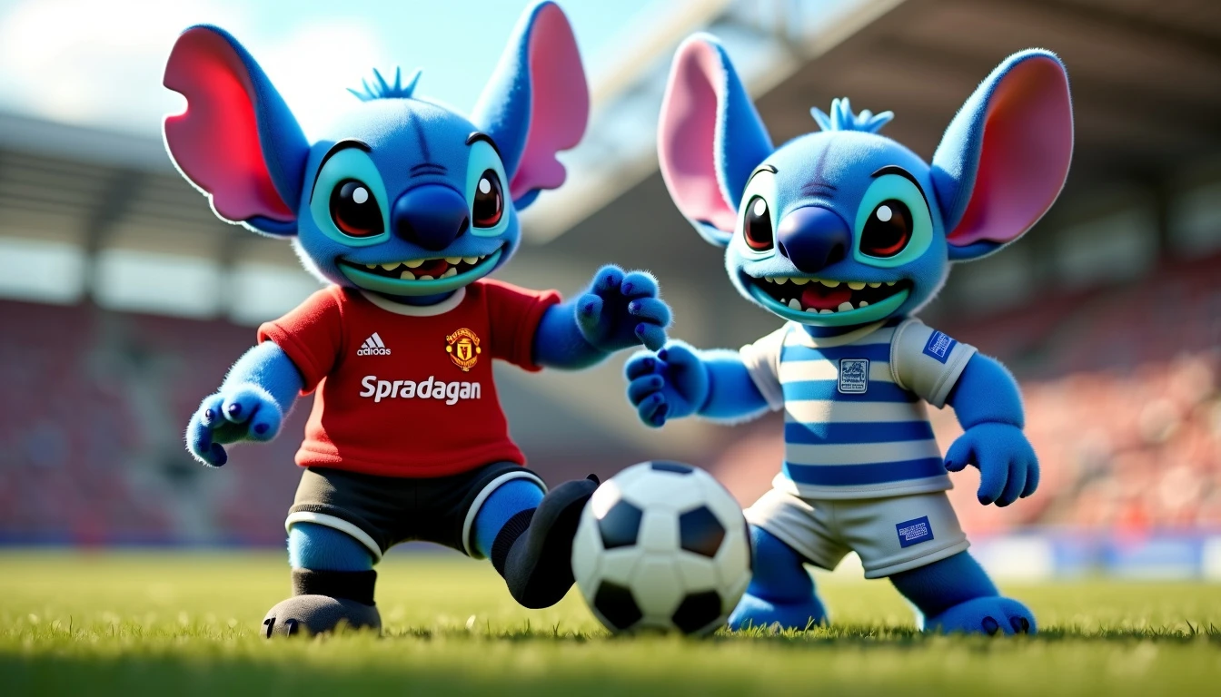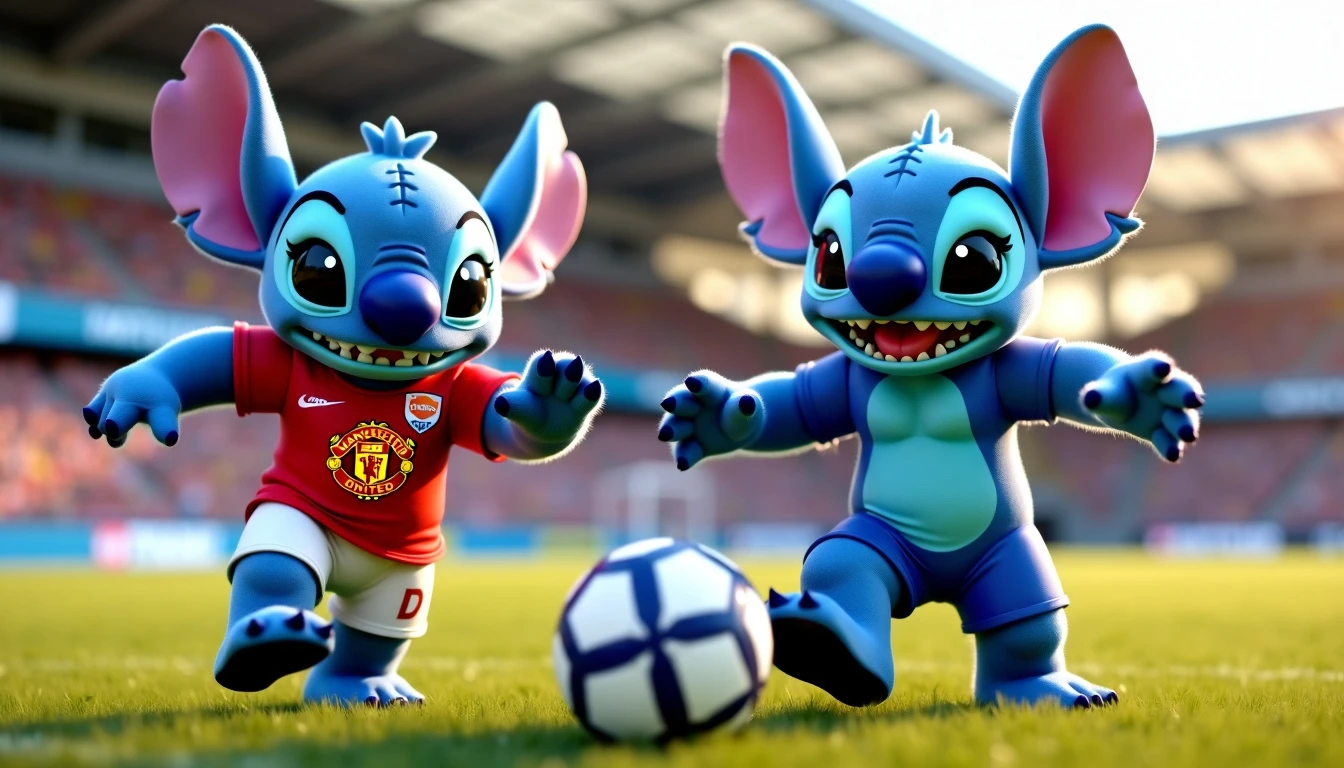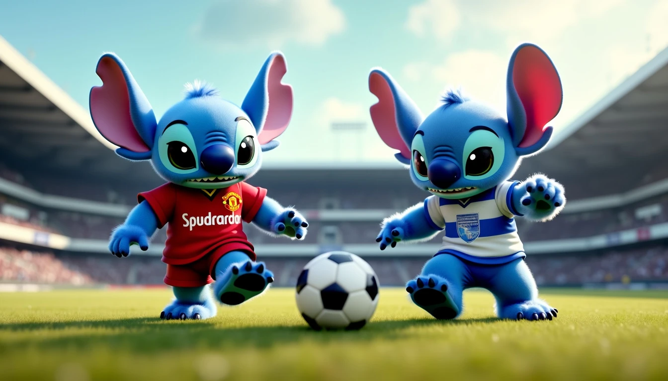 3d Stitch fluffy, equipped in Manchester United FC gear, Snapdragon brand on t shirt , playing soccer against other Stitch equipped in Brighton blue and white gear , American Express on t shirt , on Falmer stadium